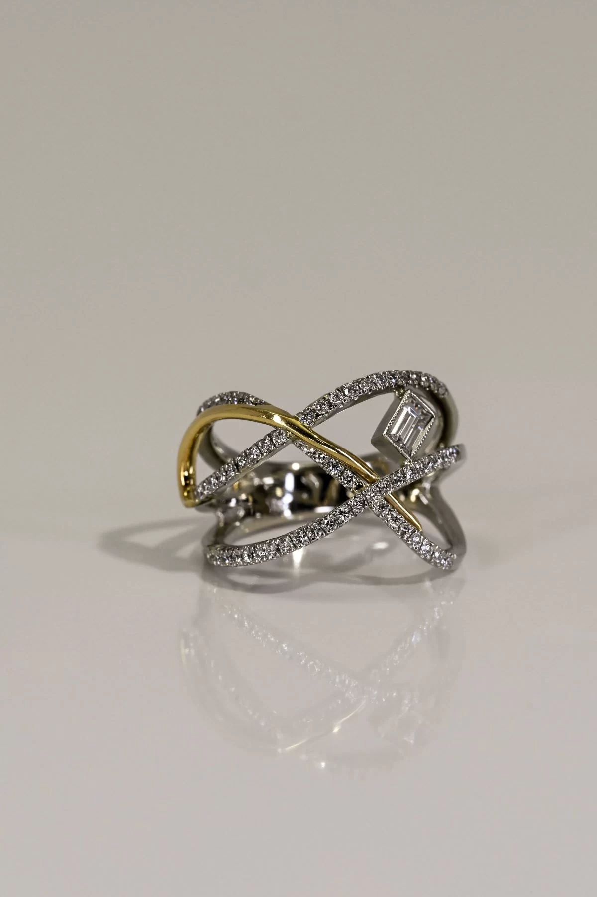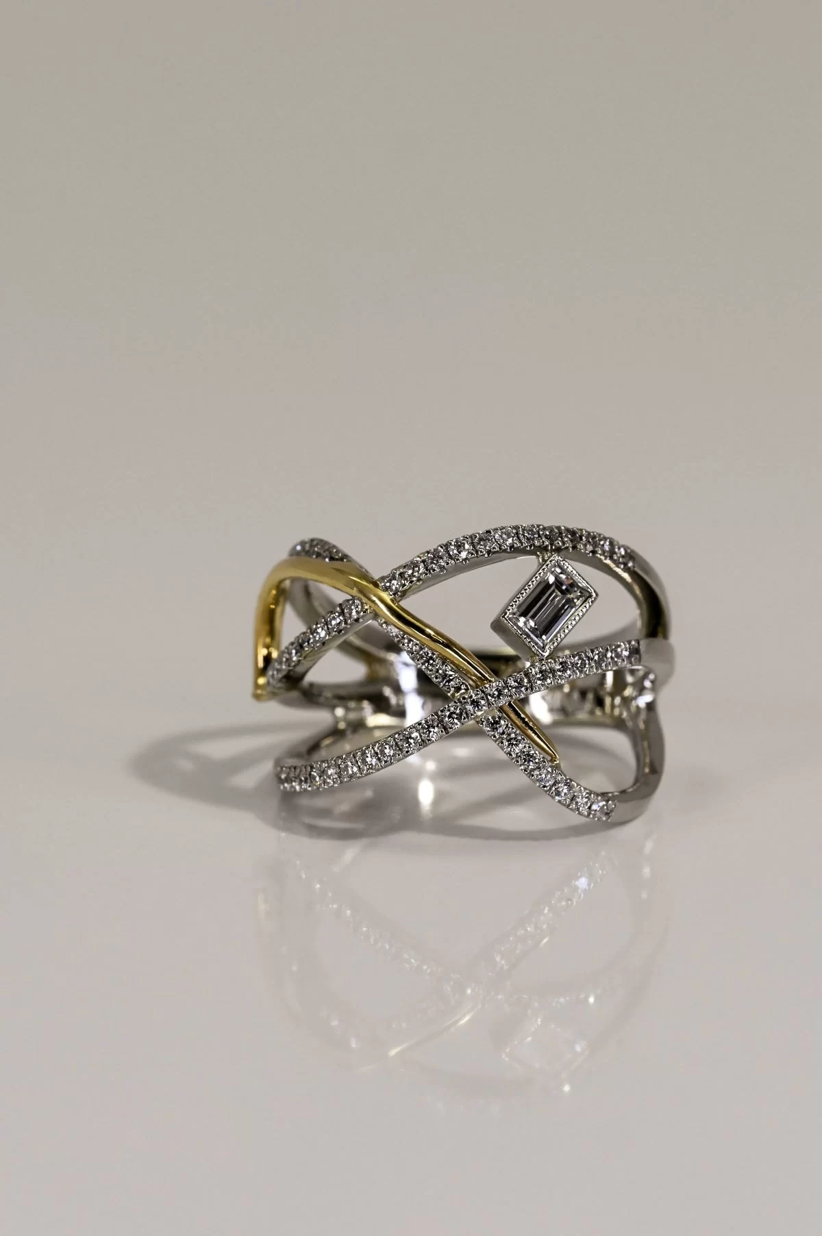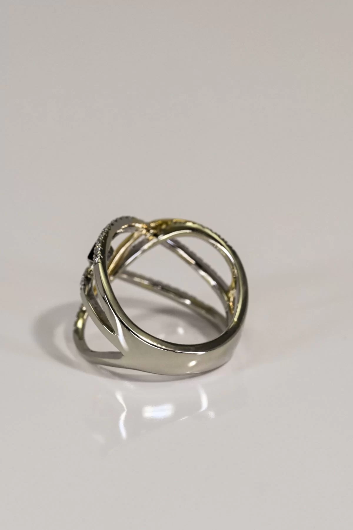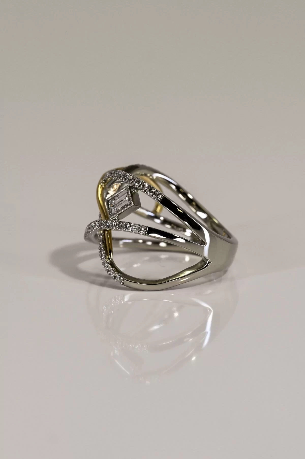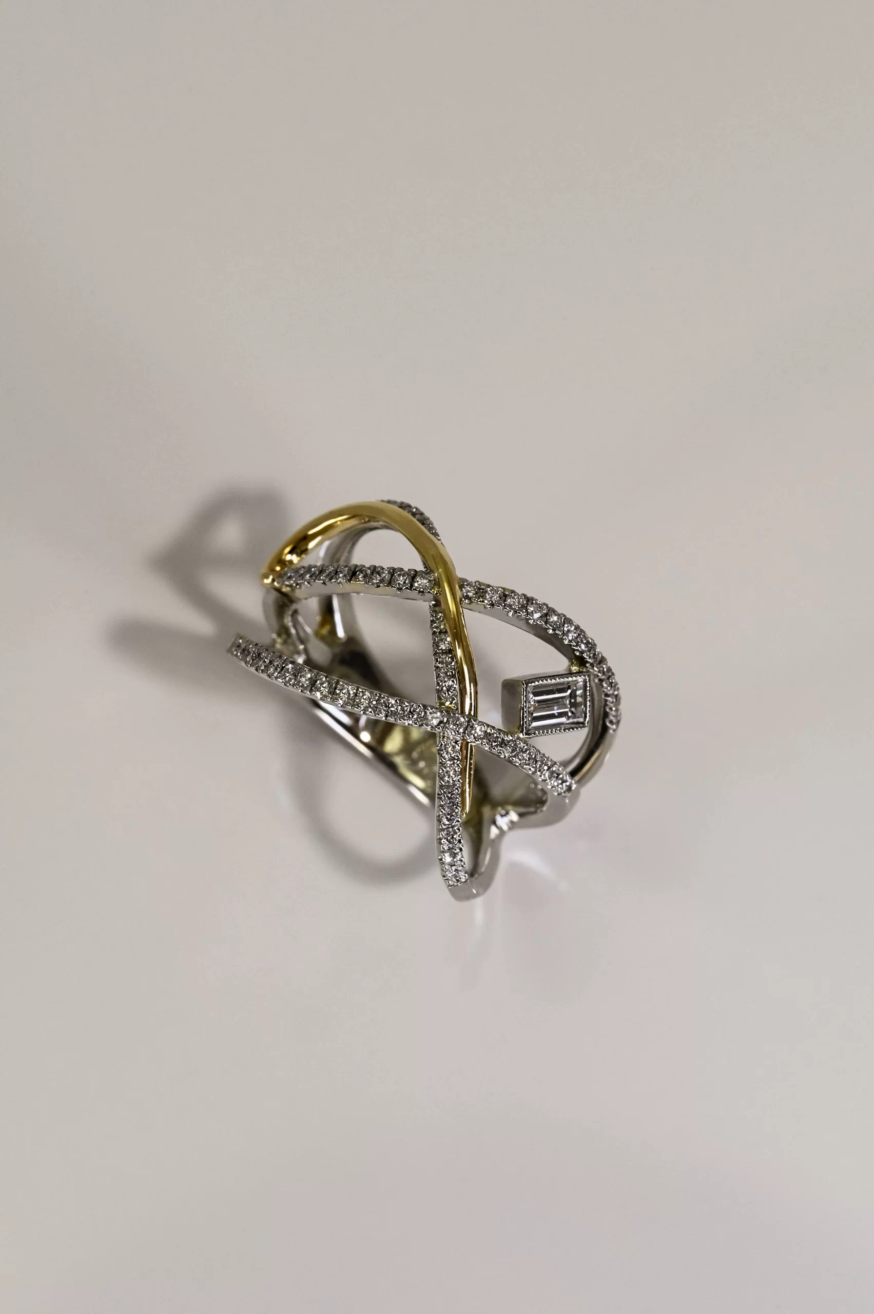 Crafted in 14Kt white and yellow gold, this cast and hand-finished dinner ring features a fluid open crossover design that wraps gracefully around the finger. The ring is micro claw set with 61 round brilliant cut diamonds, totaling 0.30 carats in VS2–SI clarity and F color, offering a continuous shimmer along the curves. Nestled within the crossover is a single baguette cut diamond, weighing 0.15 carats, graded VS clarity and F color, adding a refined geometric contrast. The combination of warm yellow and cool white gold, paired with the blend of classic and modern diamond cuts, gives this ring a timeless yet contemporary appeal.