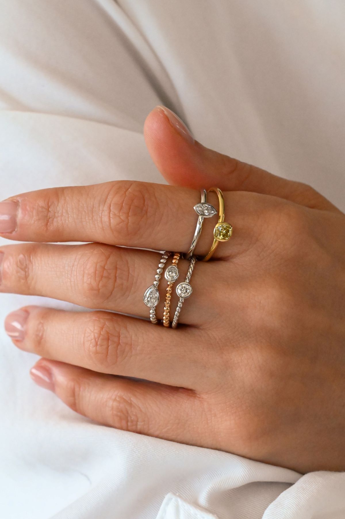 Elegantly crafted in 14 karat white gold, this minimalist stackable ring features a vertically set marquise-shaped natural diamond weighing 0.21 carats, graded SI clarity and G-H color. The sleek, polished band offers a refined silhouette, perfect for layering or wearing solo as a subtle statement of sophistication.