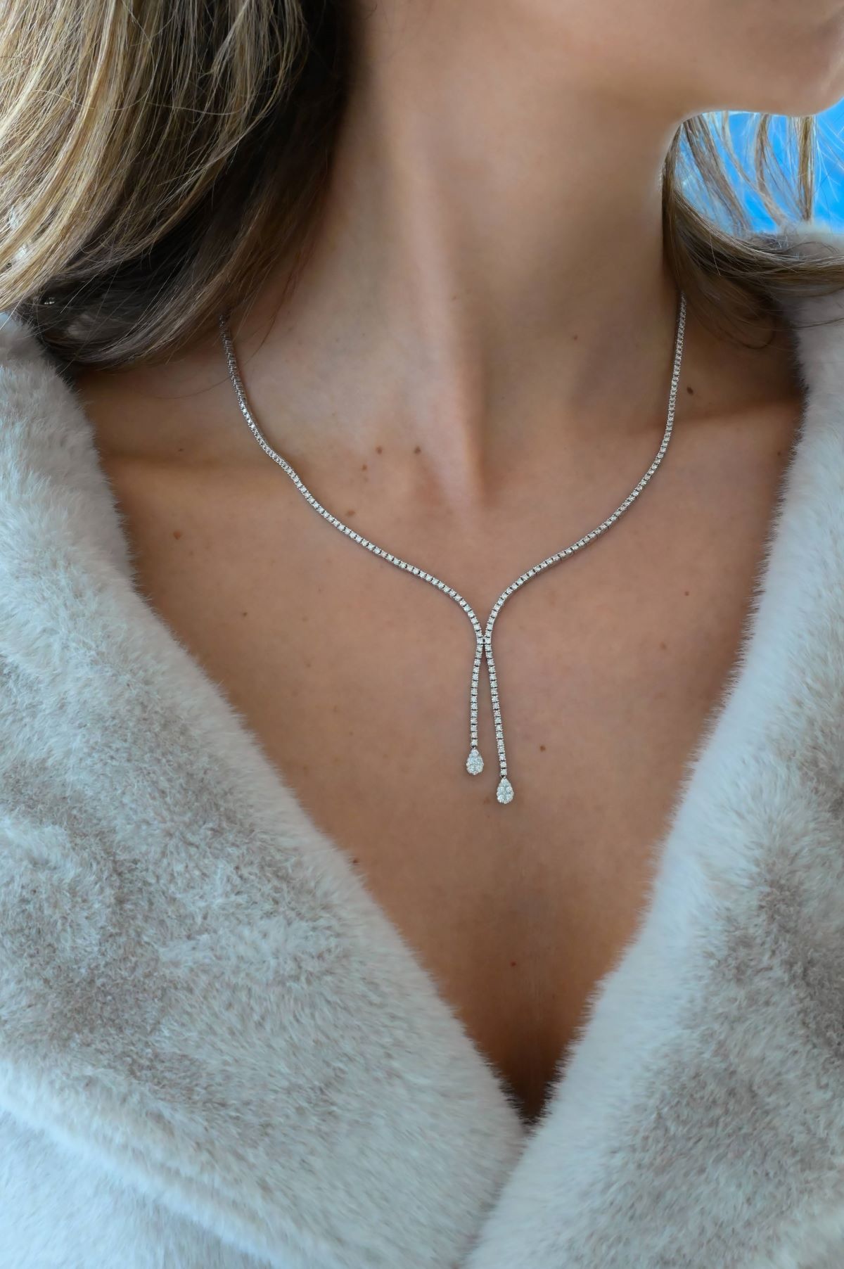 Ladies 14kt white gold diamond necklace in a classic Riviera “Y” design, accented with double pear-shaped drops. The necklace is secured with an inline box clasp and figure-eight safety for both elegance and security. Set with 2.81 carats total weight of fine diamonds, graded VS2 clarity and G color, this piece embodies timeless sophistication with a graceful silhouette.