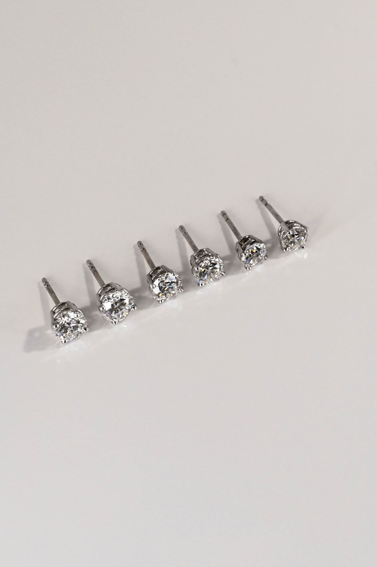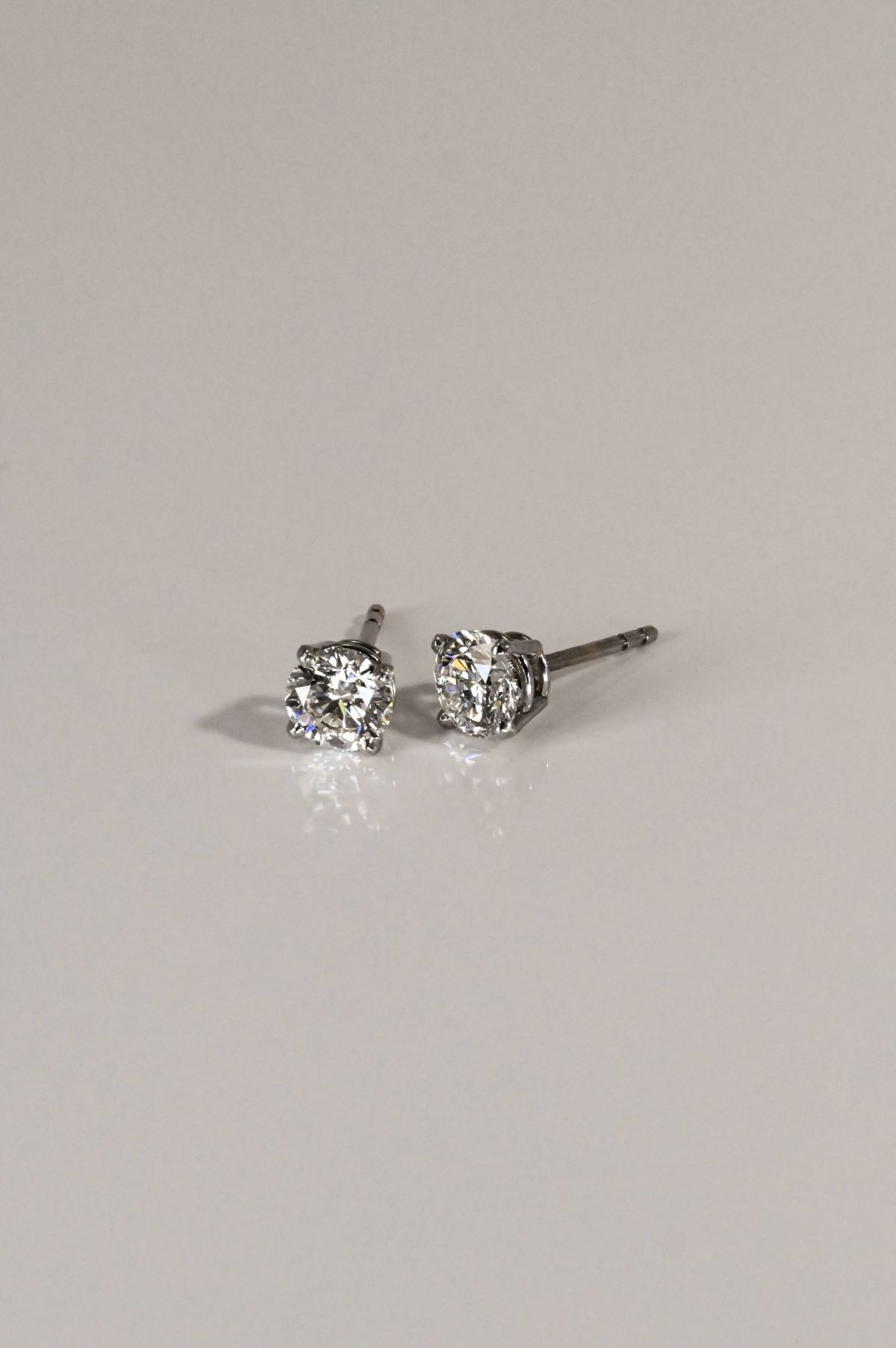 Pair of ladies diamond stud earrings crafted in 14kt white gold. Designed with a four-claw, two-level open gallery setting, each earring is fitted with stud posts and secure alpha locking backs. Set with two round brilliant cut diamonds of VS1 clarity and F–G color, with a combined total weight of 1.145 carats. A classic design that highlights fine craftsmanship and timeless brilliance.