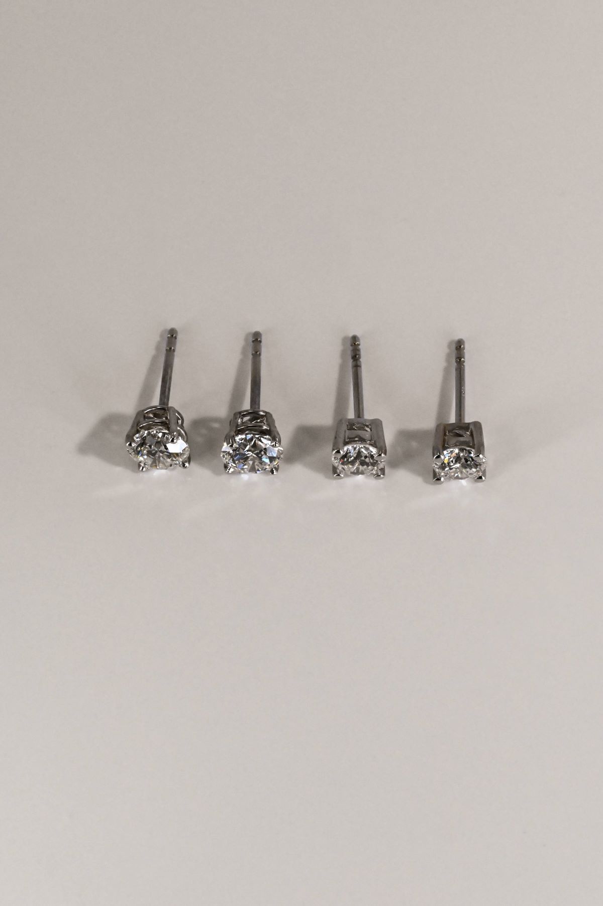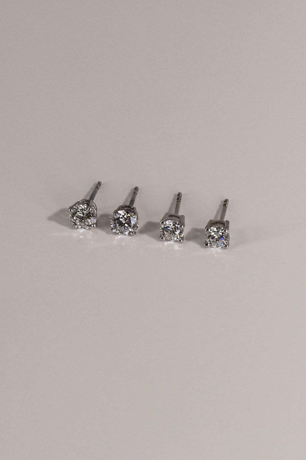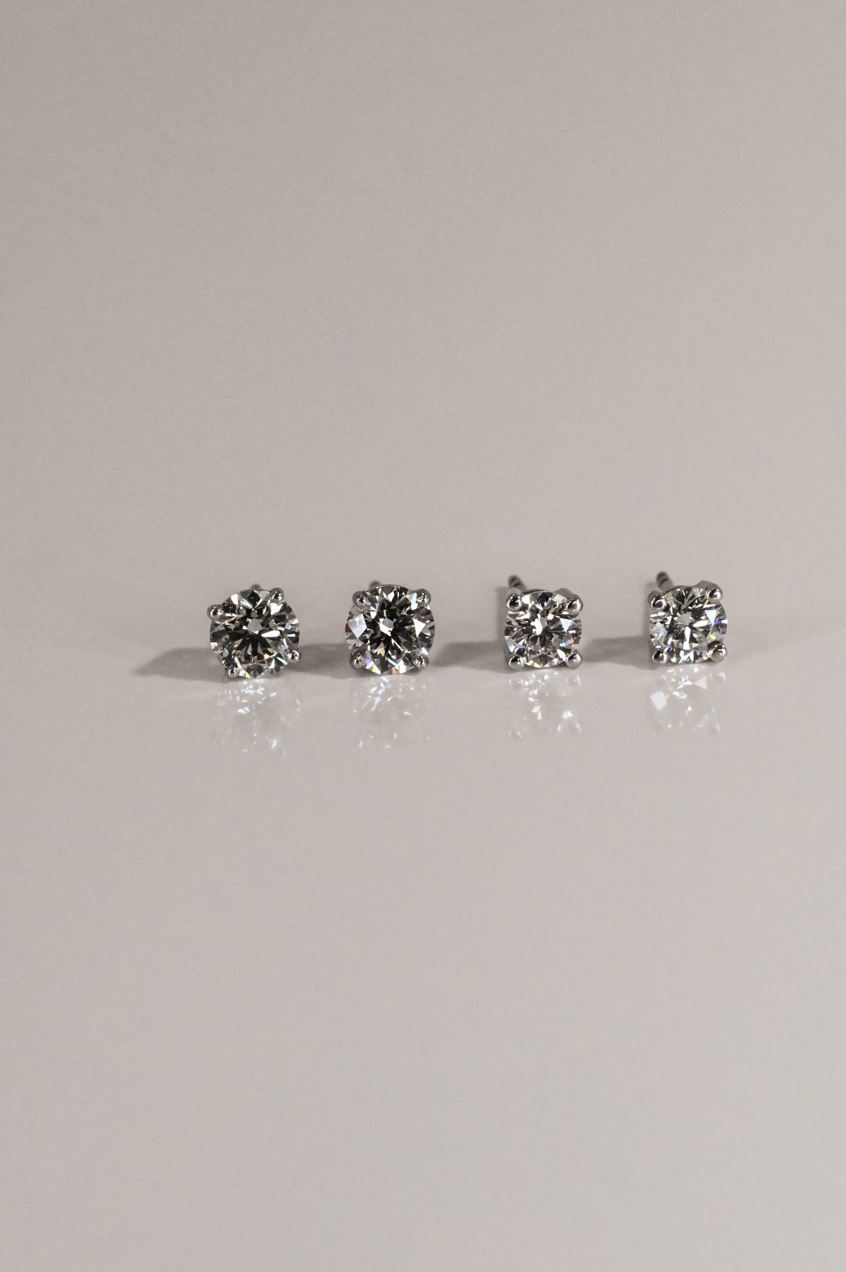 Pair of 14kt white gold stud earrings featuring a classic four-claw setting and secure alpha locking backs. Set with round brilliant cut diamonds totaling 1.22 carats, graded FG color and VS2 clarity. A timeless design that combines elegance with exceptional sparkle.