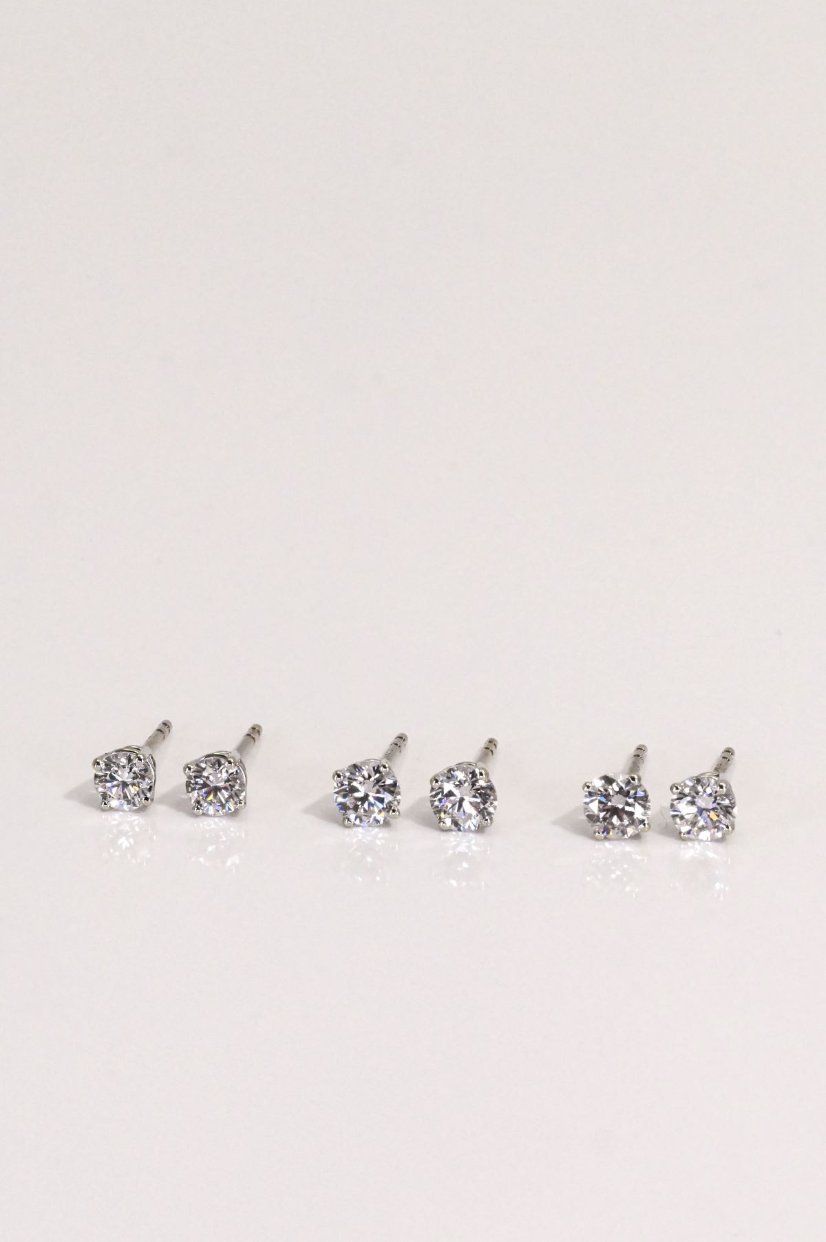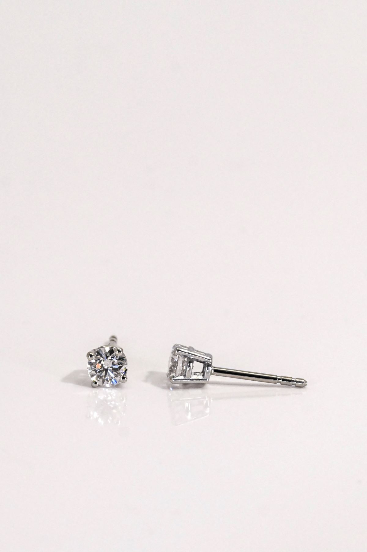 One pair of 14-karat white gold diamond stud earrings, featuring a two-level open-gallery design with secure locking alpha backs. Each earring is set with a round brilliant-cut natural diamond, with a combined total weight of 0.0482 carats, G color, SI clarity. Delicate and refined, these studs offer subtle sparkle with timeless elegance.