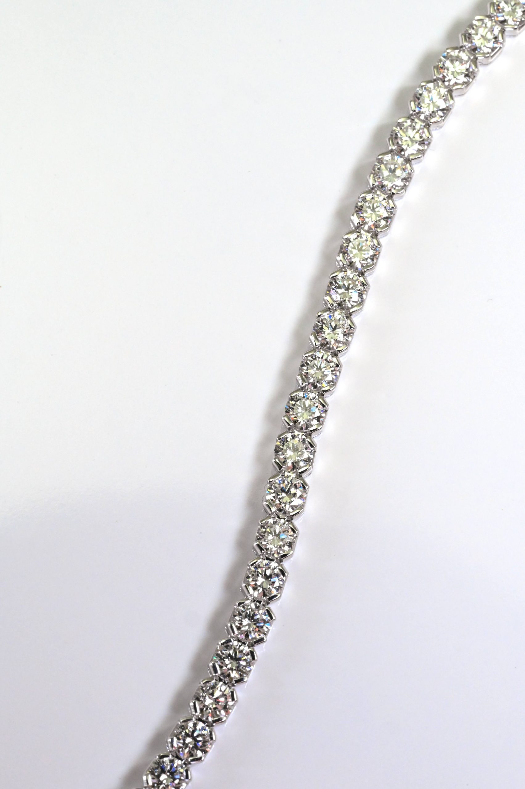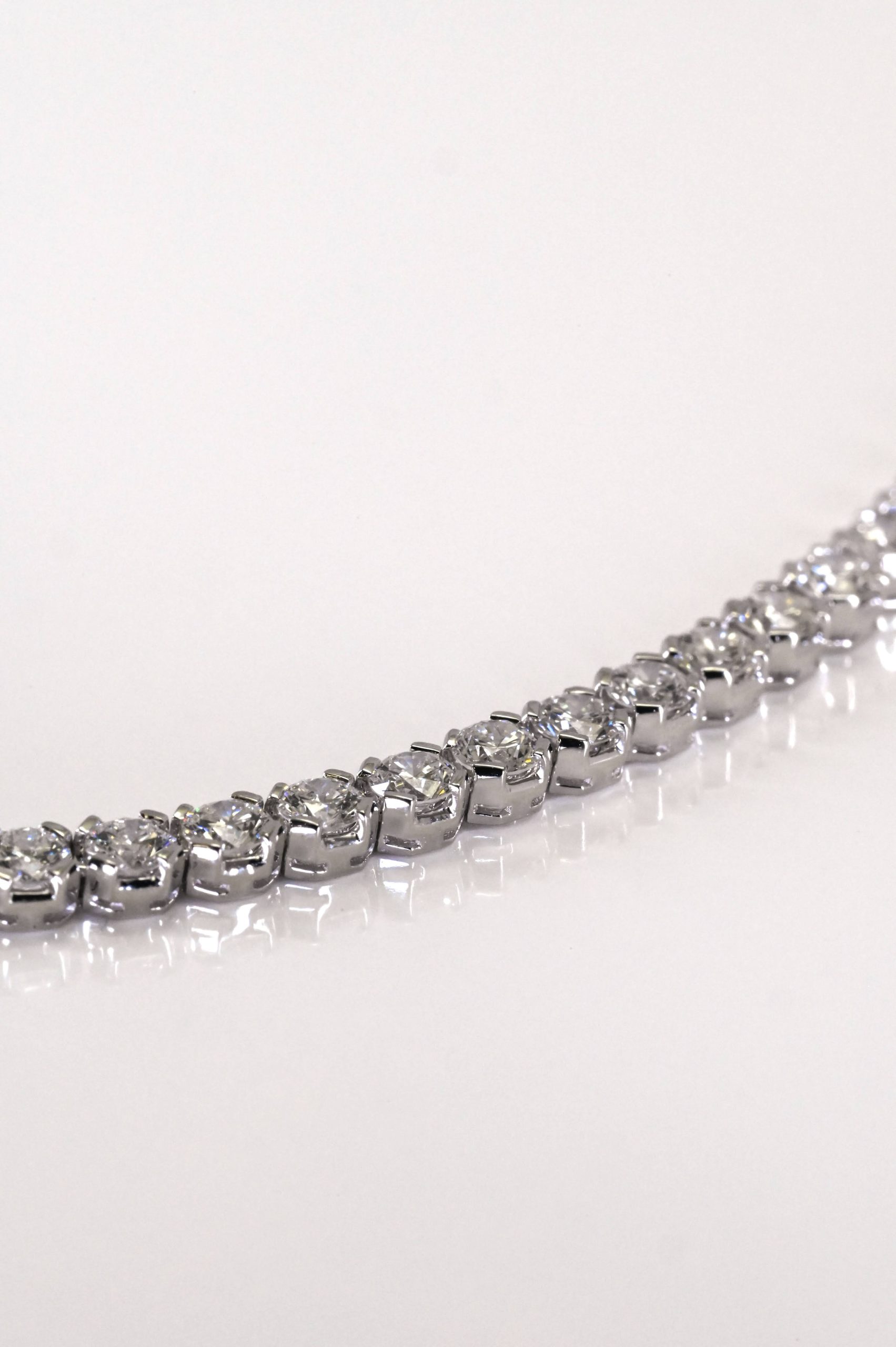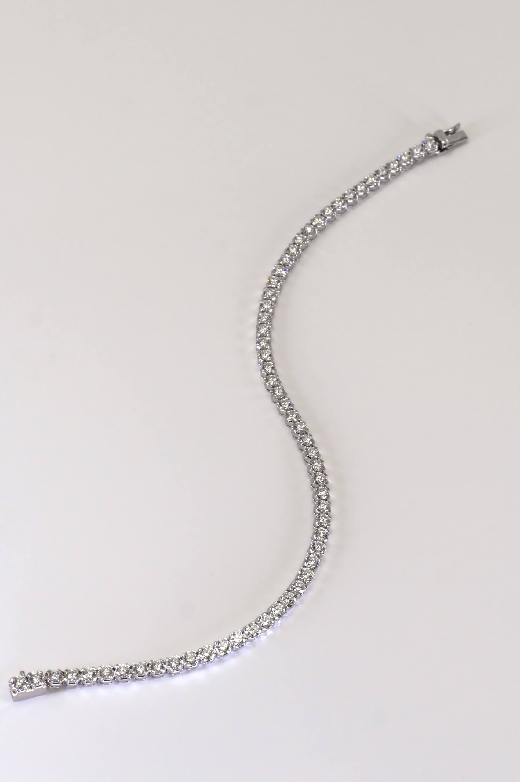 A timeless tennis style wrist bracelet crafted in luxurious platinum with a plain high polish finish. Measuring 7 inches in length and weighing 8.78 grams, the bracelet is set with fifty nine round brilliant cut natural diamonds totaling 4.67 carats. Graded VS1 clarity and F colour, the diamonds deliver exceptional brilliance and uniform sparkle. Elegant, refined, and beautifully balanced, this bracelet is a classic statement of enduring luxury and craftsmanship.