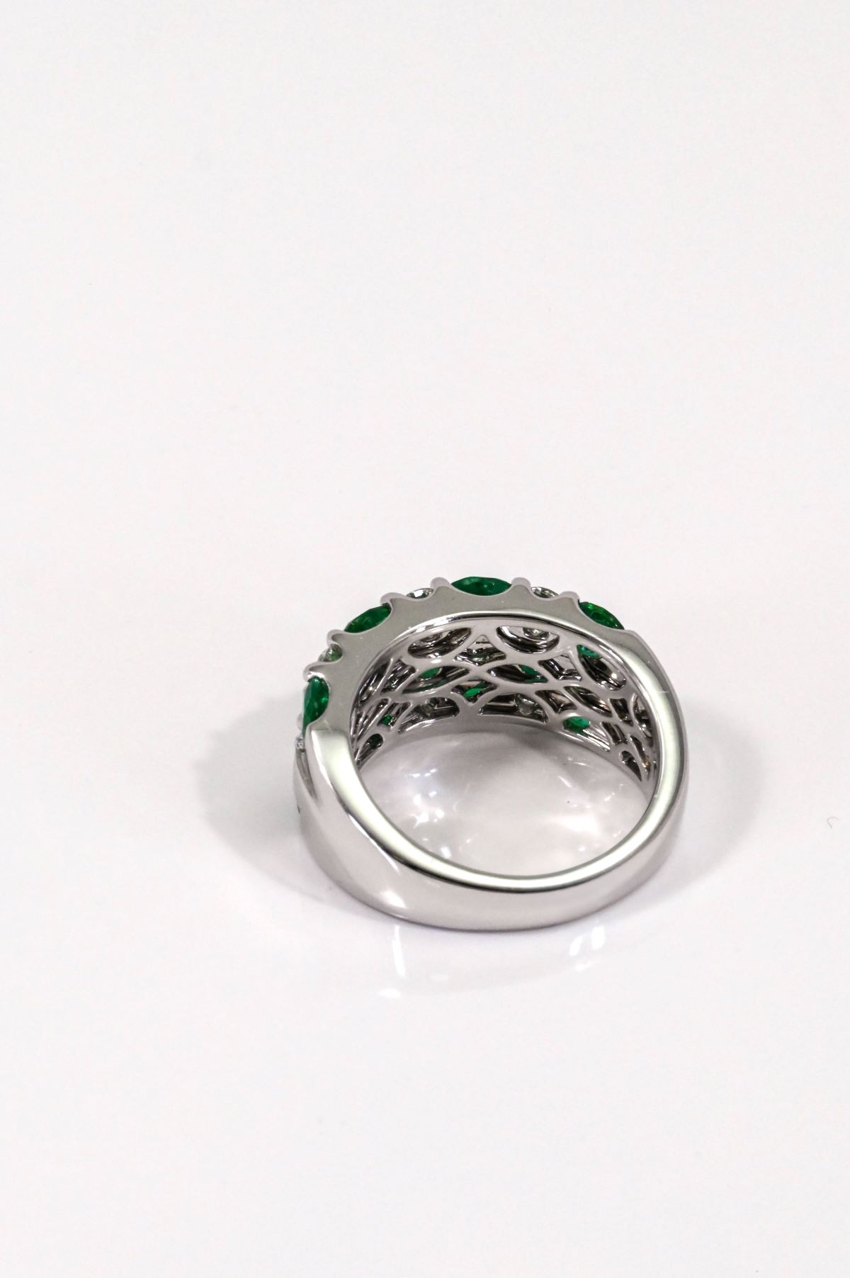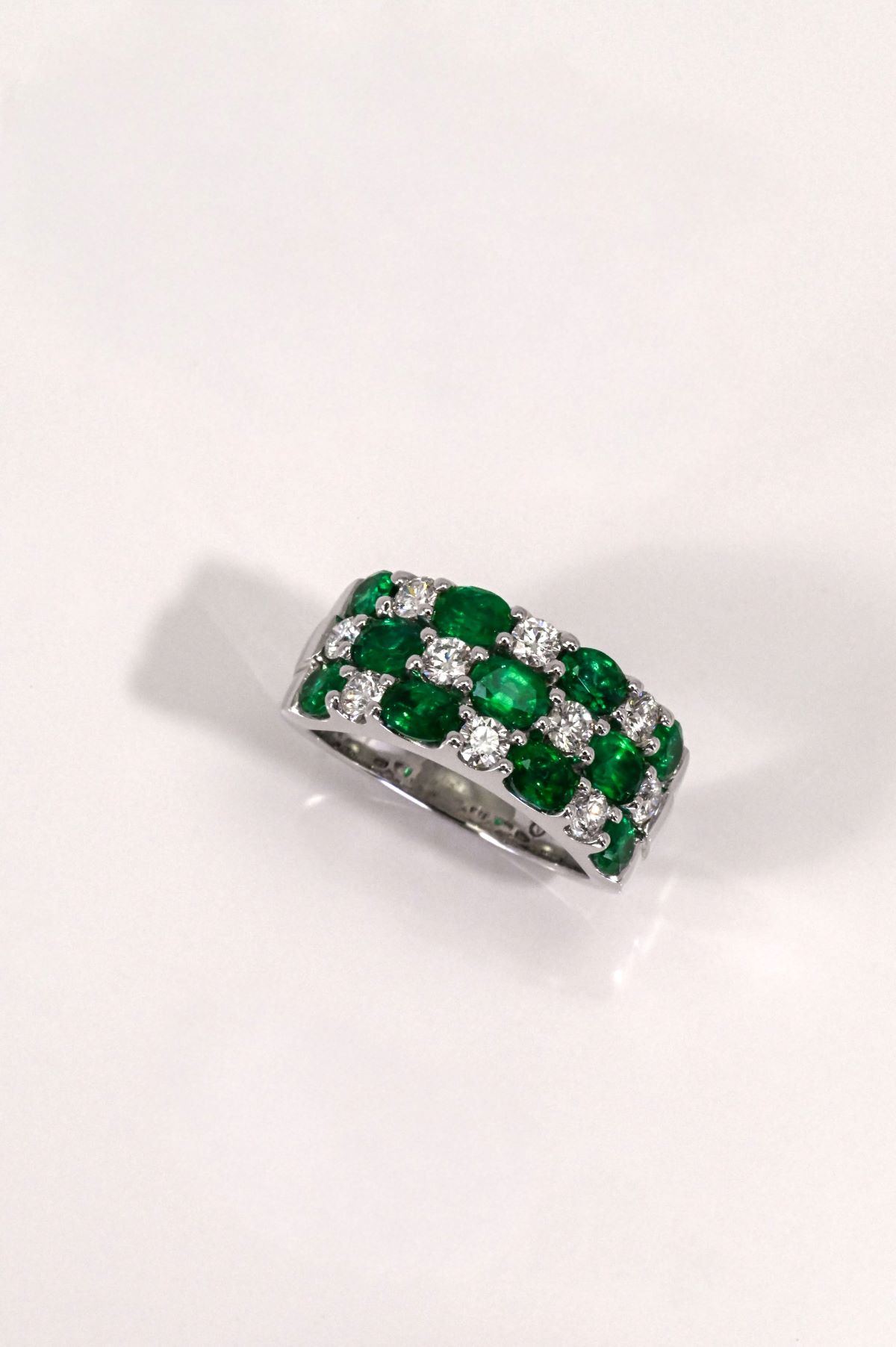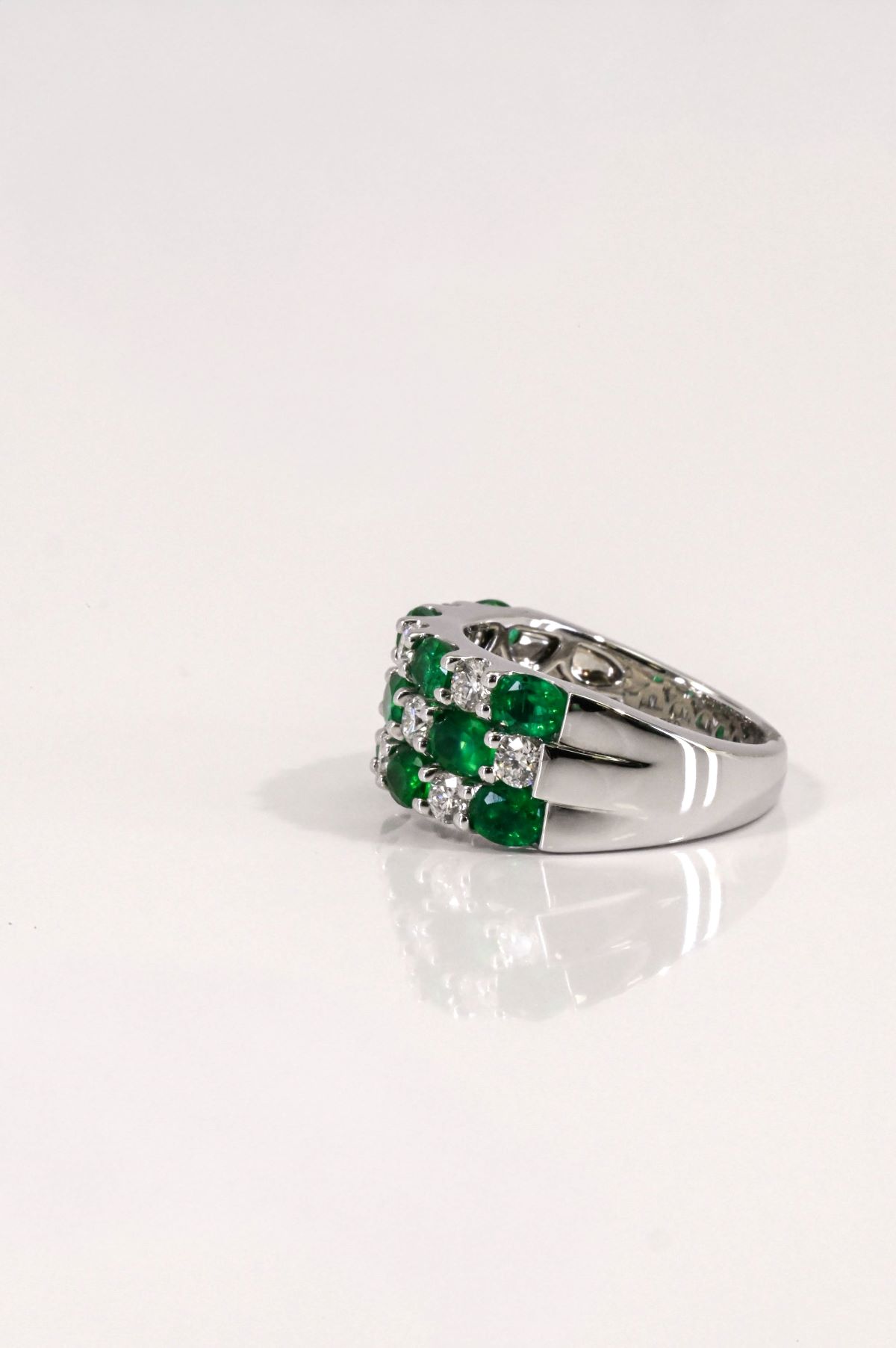 Crafted in 18K white gold with a tapered shank and high-polish finish, this striking ring features three rows of alternating oval emeralds and round brilliant-cut diamonds. Set with eleven natural Colombian emeralds, totaling 2.32 carats, each stone displays a vivid fine green color and eye-clean clarity. The emeralds are beautifully complemented by ten round brilliant-cut diamonds totaling 0.79 carats, graded VS/F for exceptional quality. A bold yet elegant design, perfect as an anniversary or dinner ring, blending vibrant color with timeless brilliance.