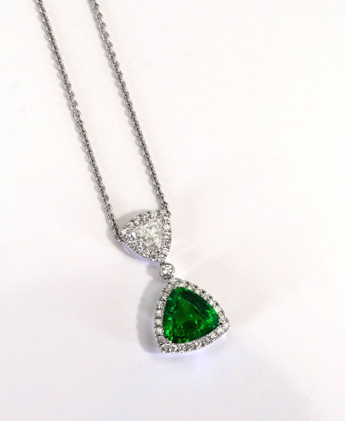 Crafted in 18K white gold, this striking pendant showcases a trilliant-shaped halo design, suspended from an inverted trilliant diamond-set bail on a 16-inch fine rolo link chain. At its center rests a 1.18ct trilliant-faceted natural Ethiopian emerald of very fine vivid green color, paired with a 0.21ct trilliant-cut natural diamond. Surrounding the centerpiece, 43 round brilliant-cut natural diamonds with a total weight of 0.24cts. add exceptional sparkle and refinement.