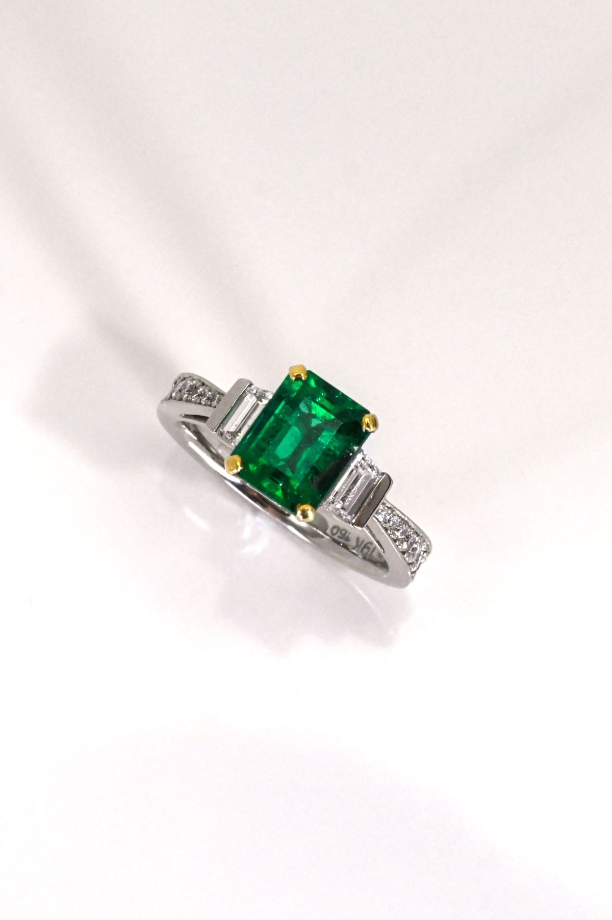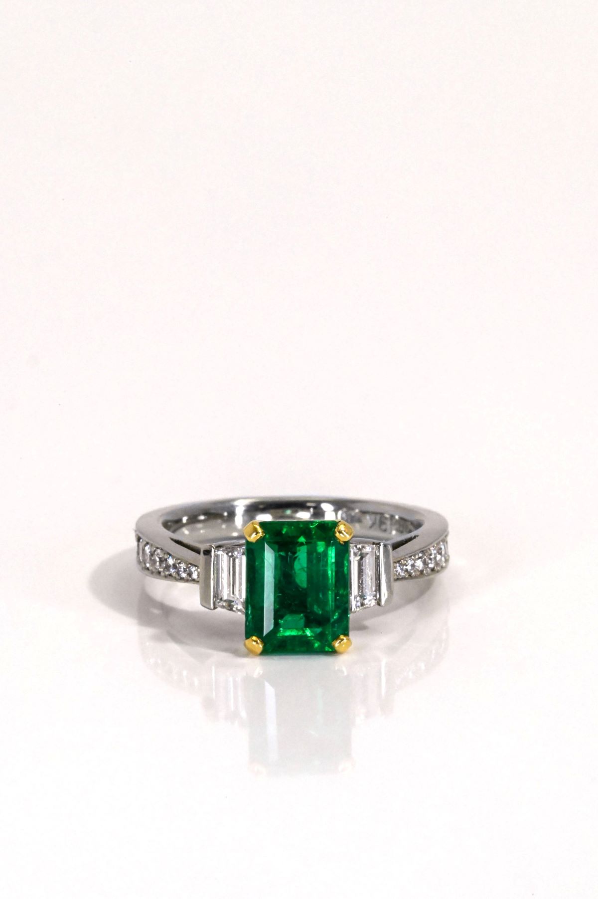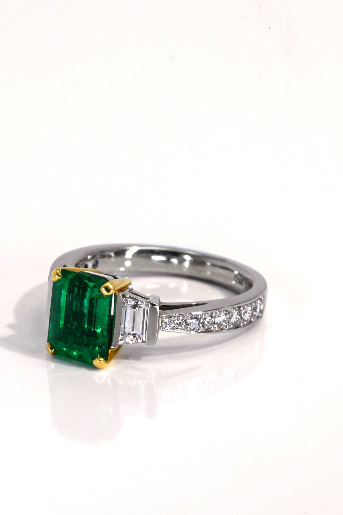 A stunning showcase of timeless elegance, this 19Kt white gold ring features a vibrant 1.73 carat natural emerald (beryl) with an intense, rich green hue. The emerald is flanked by two trapezoid step-cut diamonds totaling 0.44 carats, each with VS clarity and F/G color, adding geometric brilliance to the design. Sixteen round brilliant cut diamonds (totaling 0.284 carats, VS clarity, F/G color) complete the look, set along the tapered soft pipe shank with a polished finish. Cast and hand finished for exceptional quality, this ring is a sophisticated statement of luxury.