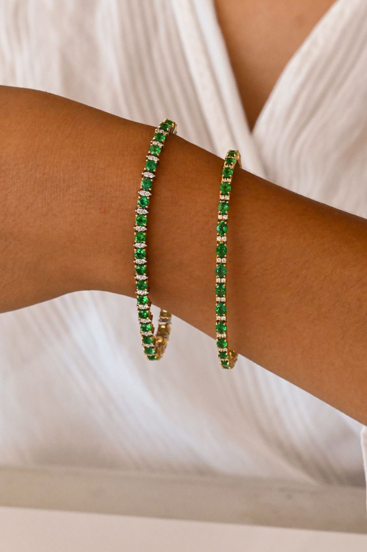 Timeless and luxurious, this 18 karat yellow gold tennis bracelet is set with 31 oval faceted natural emeralds, totaling 4.29 carats, in a rich and vivid medium-dark green hue. Alternating with 62 round brilliant cut natural diamonds totaling 0.56 carats, the design offers a graceful interplay of color and sparkle. Measuring 7 inches in length, it is finished with an integrated box clasp and undercarriage safety clasp for secure, elegant wear. A classic piece with refined beauty and vibrant presence.