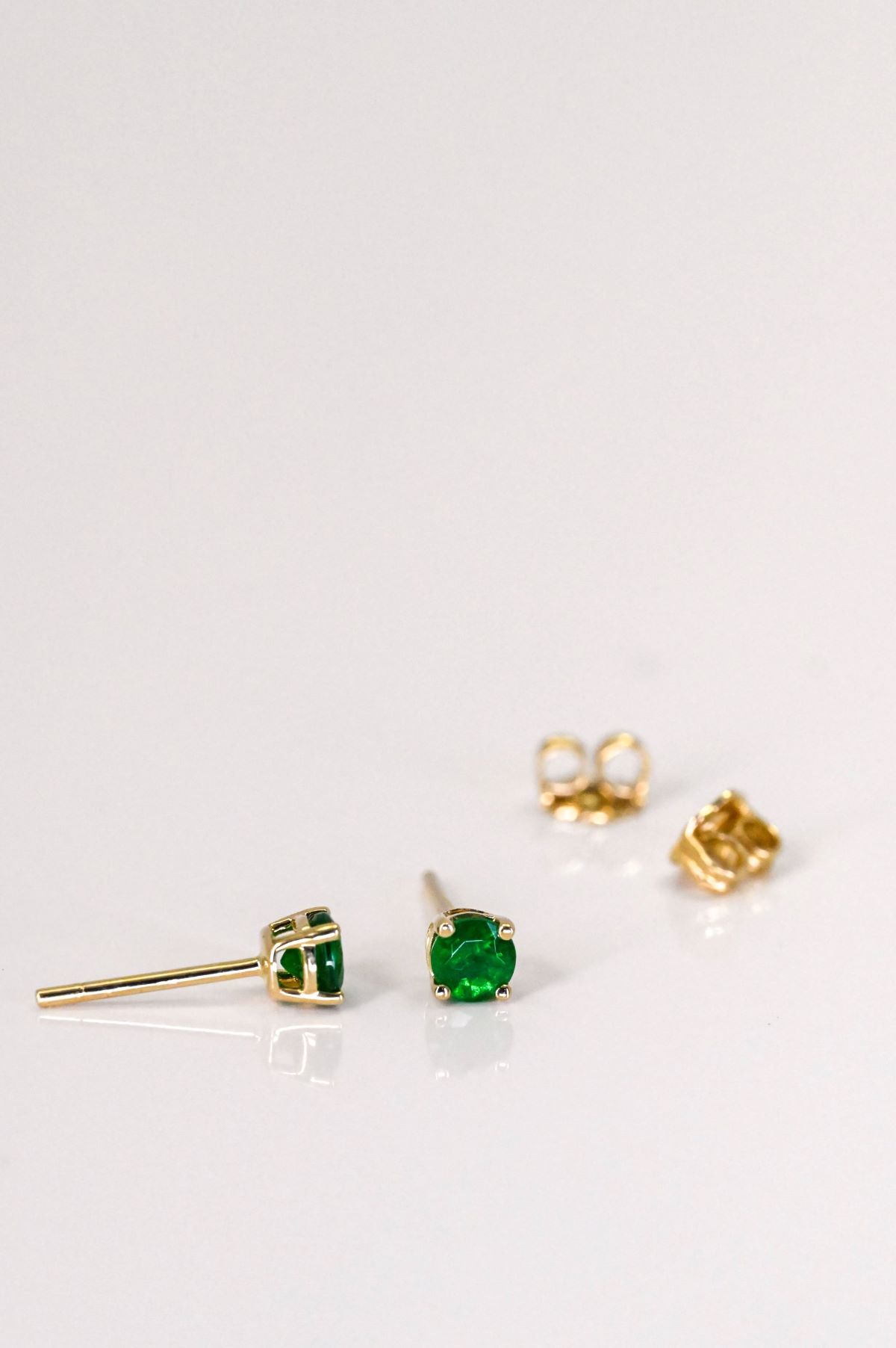 One pair of 14-karat yellow gold Emerald stud earrings, crafted with two-level 4-claw open-gallery settings and fitted with posts and butterfly backs. Each earring features a 3.5 mm round faceted natural Emerald, fine green in colour, with a combined total weight of 0.33 carats. A timeless and elegant touch of vivid green brilliance.