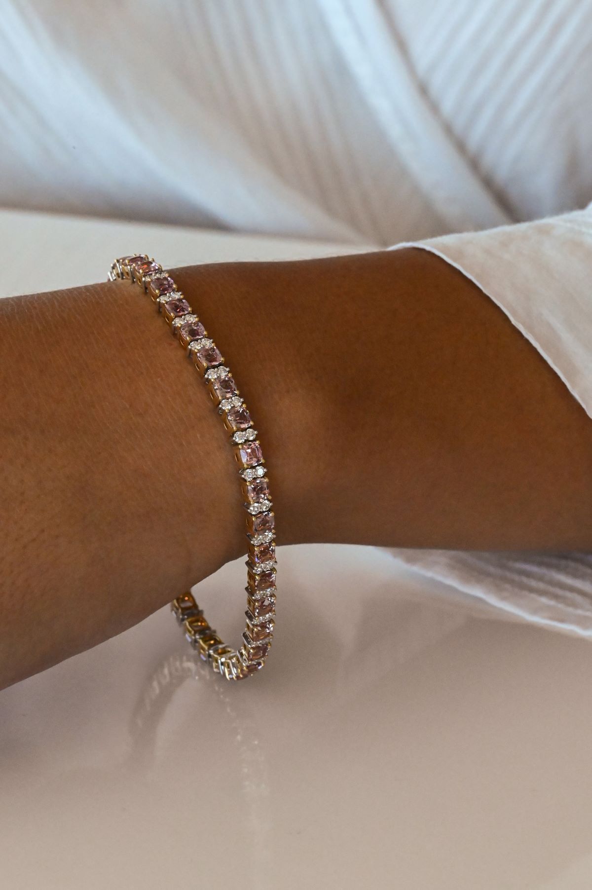 Elegant and refined, this 18 karat white and yellow gold tennis-style bracelet features a stunning sequence of pastel pink cushion brilliant cut natural Malaya garnets, totaling 8.66 carats. Alternating with sparkling small round natural diamonds totaling 1.38 carats, the design offers a delicate contrast of color and brilliance. Measuring 7 inches in length, the bracelet is secured with an inline box clasp and two figure-eight safety clasps for both beauty and peace of mind. A graceful statement of soft color and timeless elegance.