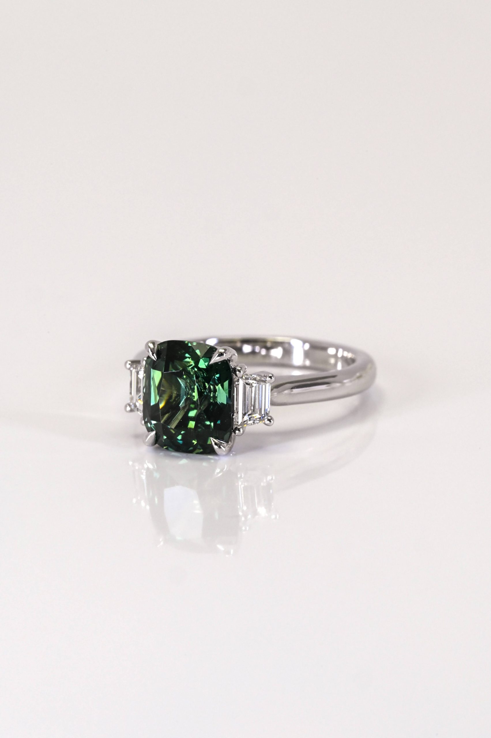 An exceptional three stone dinner ring crafted in luxurious platinum. The design features a reverse tapered half round shank with a plain high polish finish, creating a refined and elegant profile. At the center sits a remarkable 4.01 ct cushion faceted natural sapphire, certified unheated and displaying a rare teal green colour. The sapphire is beautifully flanked by two trapezoid step cut natural diamonds totaling 0.53 carats, graded VS1 clarity and FG colour. A striking and sophisticated piece that showcases rarity, balance, and timeless craftsmanship.