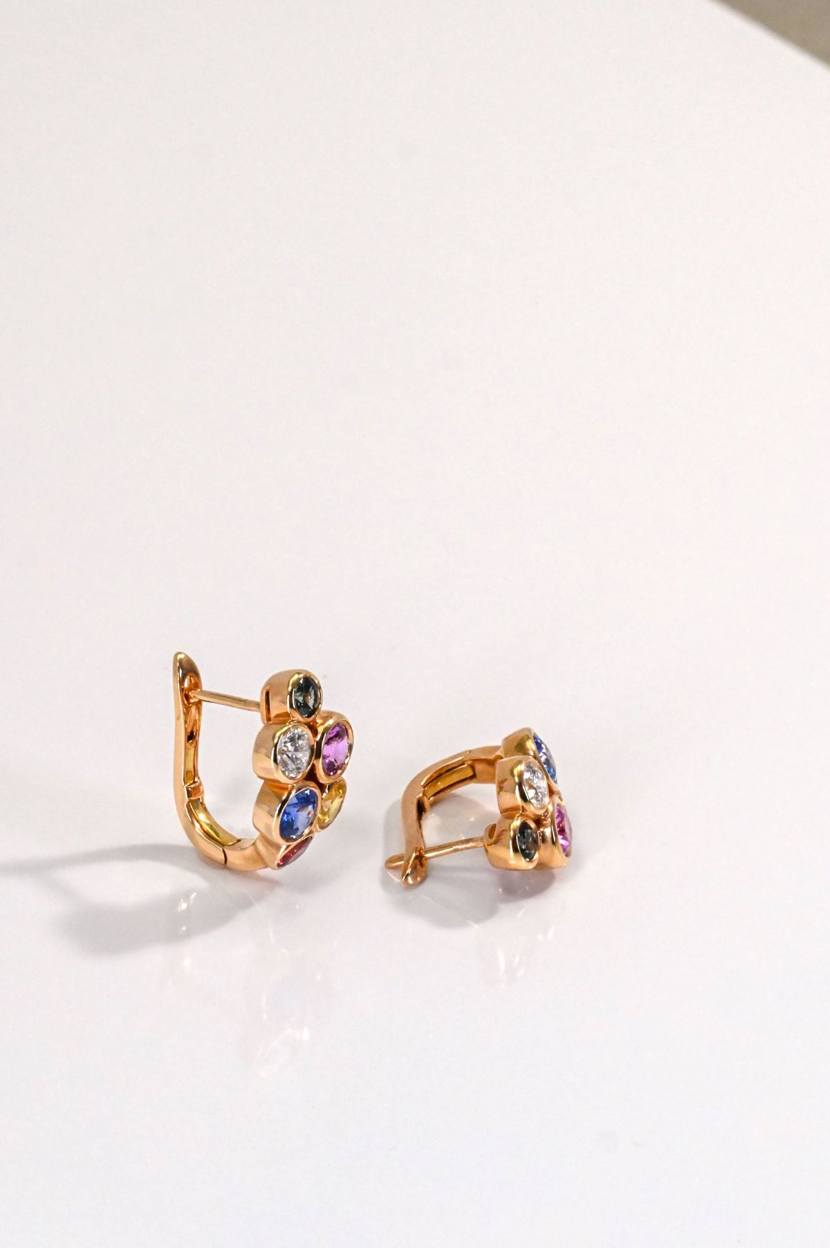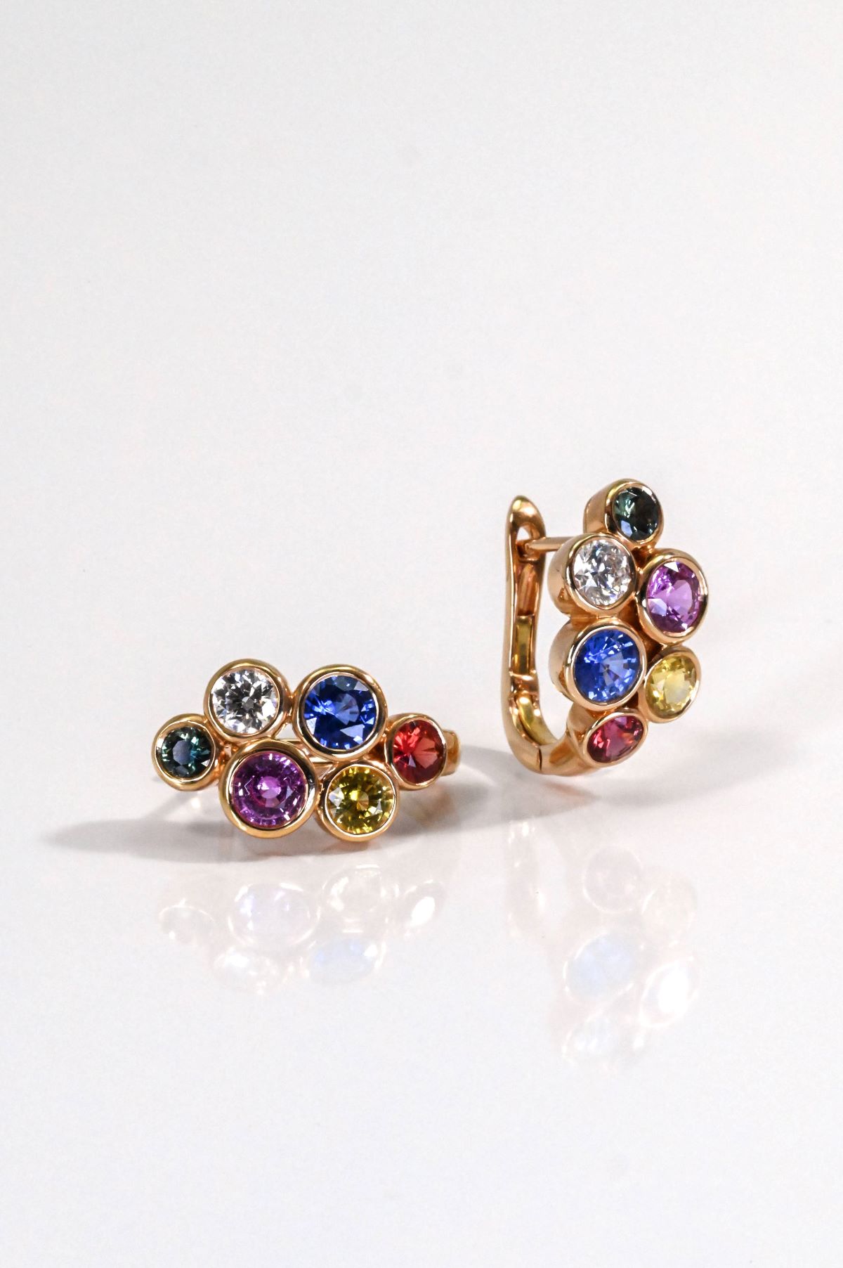 A vibrant pair of pierced earrings crafted in warm 18 karat rose gold, designed in an elegant bubble hoop style. Each earring is individually bezel set with round natural corundum sapphires in green, pink, blue, yellow, and orange, totaling 3.00 carats. Accented by two natural diamonds with a combined total weight of 0.28 carats, the earrings are finished with attached posts and secure lever backs. A joyful yet refined design that blends rich colour, modern elegance, and fine craftsmanship.