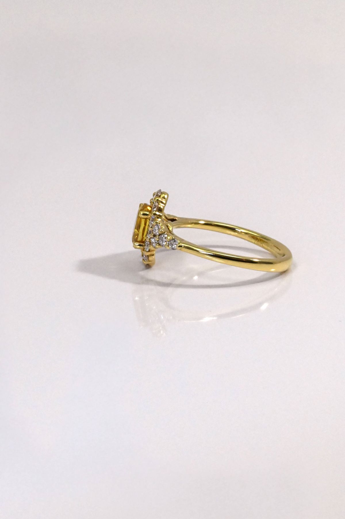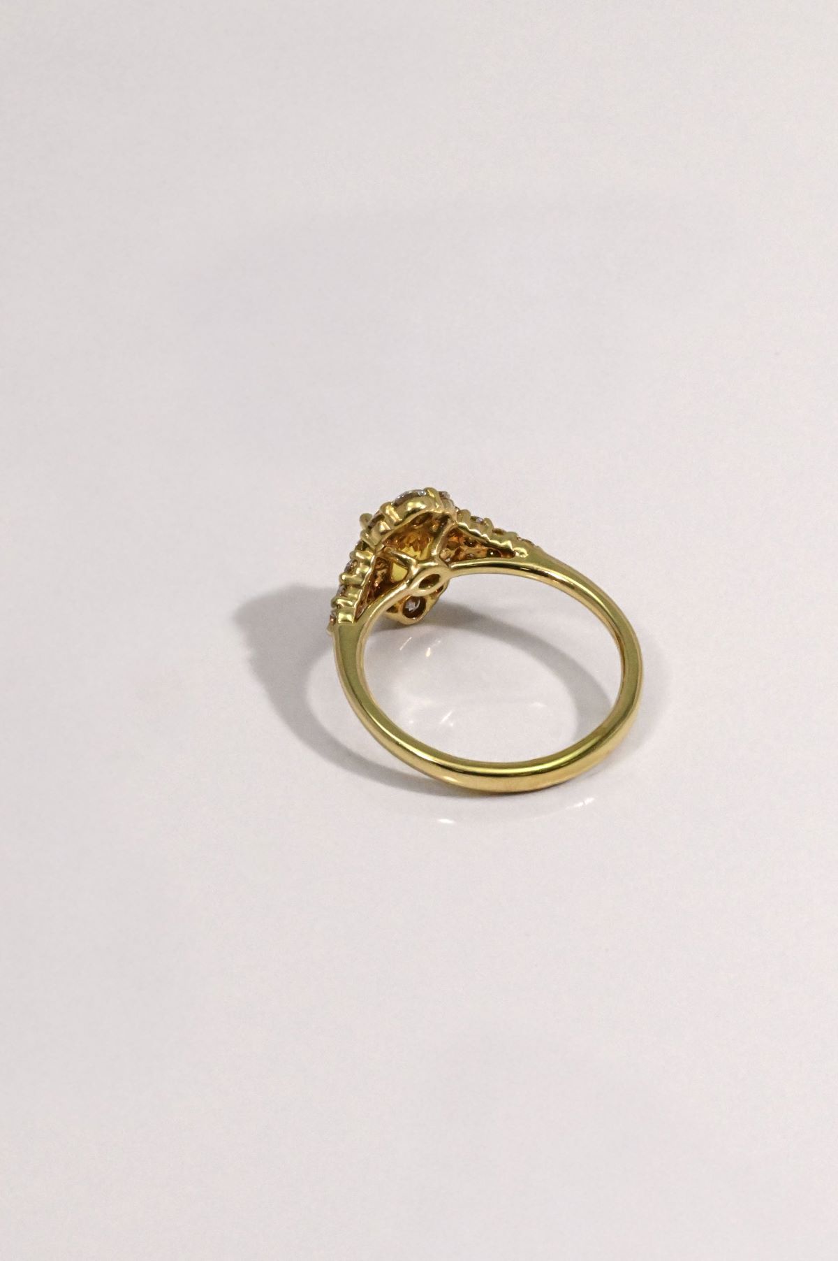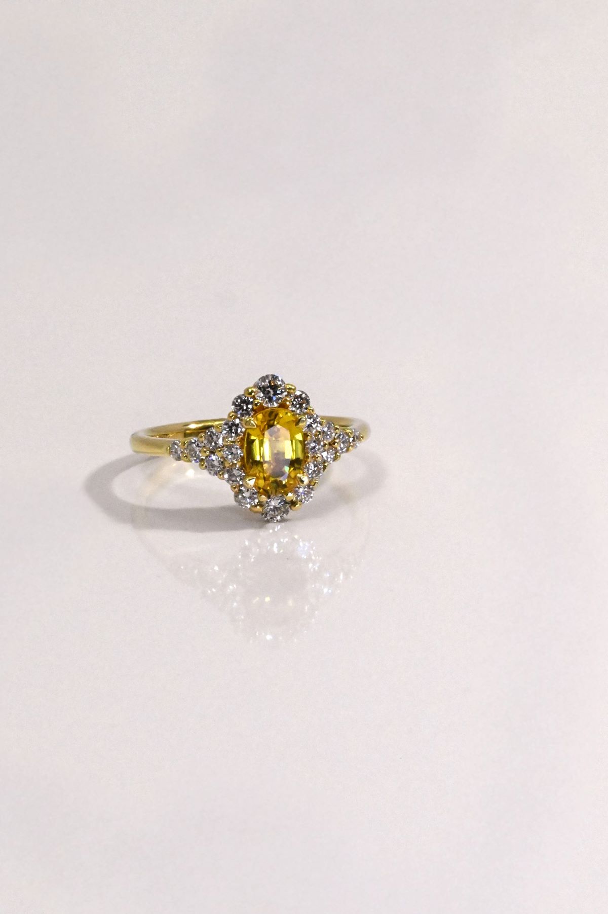 This elegant dinner ring is crafted in rich 18Kt yellow gold and showcases a stunning 1.29ct oval-cut natural yellow Sapphire, prized for its vibrant golden hue and exceptional clarity. The vivid center stone is beautifully framed and accented by a total of 0.59cts of round brilliant cut natural Diamonds, graded VS clarity and F color, offering a radiant contrast and refined sparkle. Designed for timeless sophistication, this piece blends classic color with enduring craftsmanship—ideal for special occasions or adding a touch of luxury to everyday wear.