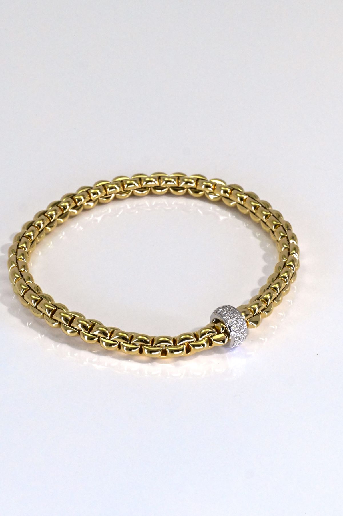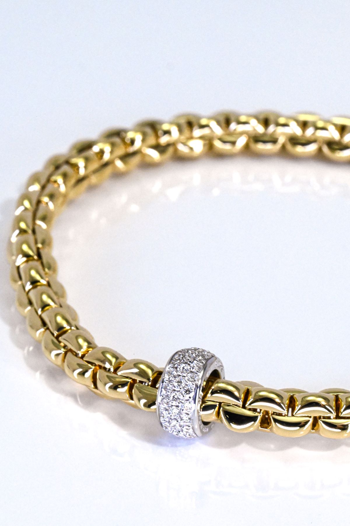FOPE 18-karat yellow gold “Eka” collection expansion-link wrist bracelet in size Medium, complemented by a white gold stationary slider-style rondelle set with 0.37 carats of round brilliant-cut natural diamonds. Flexible, luxurious, and effortlessly wearable — a hallmark of the Eka collection’s refined craftsmanship.