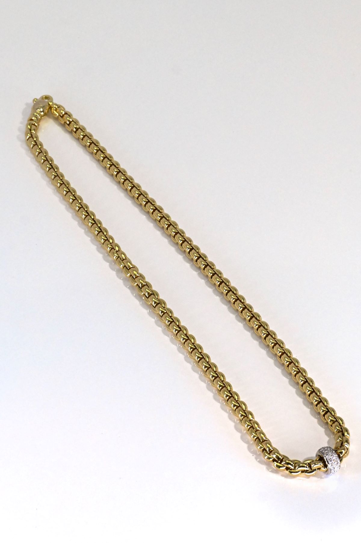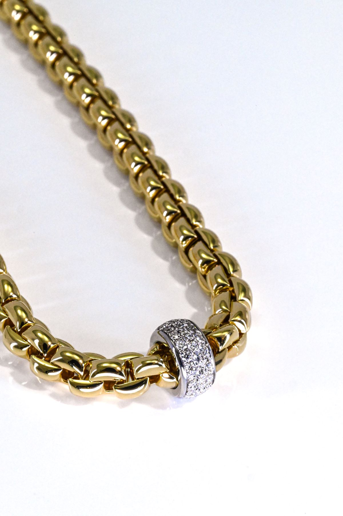 FOPE 18Kt yellow gold “Eka” collection necklace, 43 cm in length, featuring a white gold diamond-set stationary slider-style rondelle set with 0.37 cts. of round brilliant-cut natural diamonds and completed with an integrated lobster claw clasp.