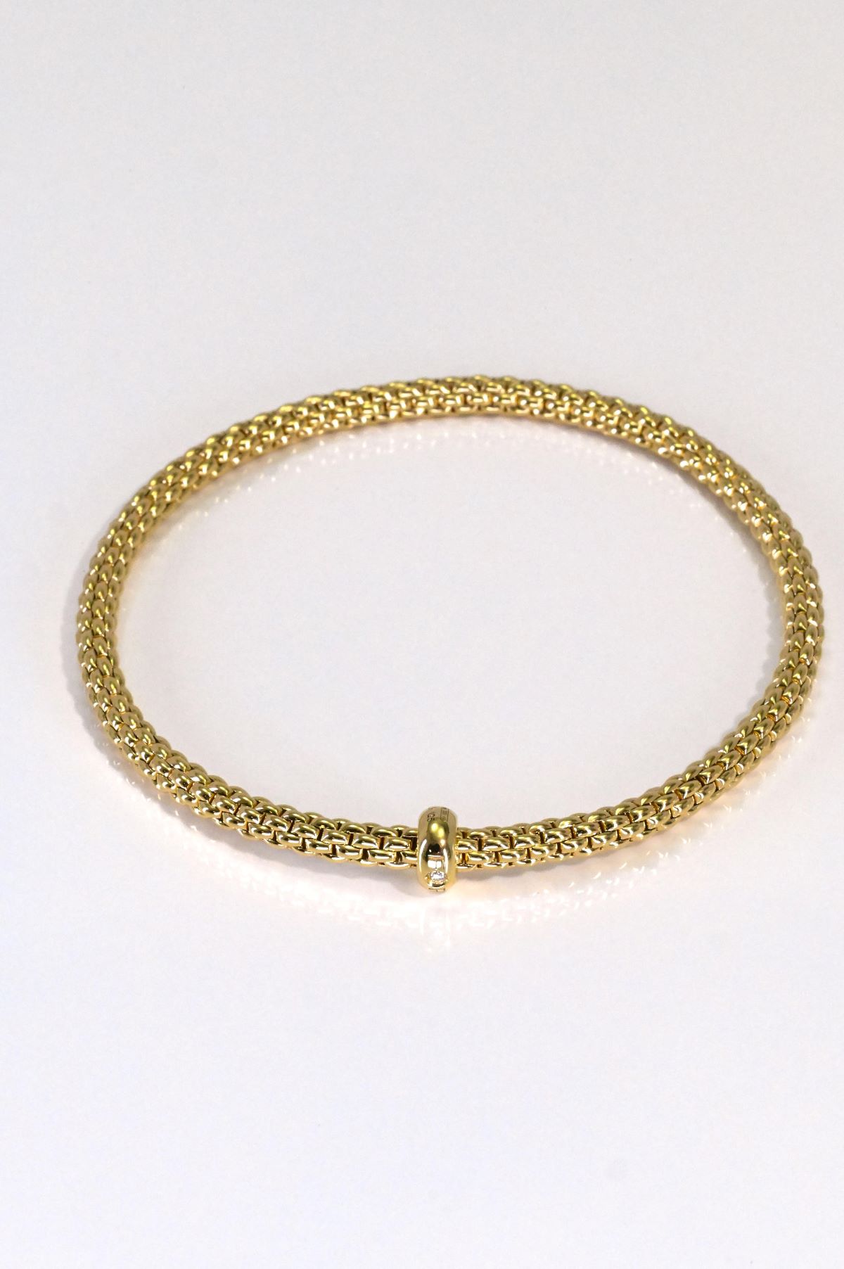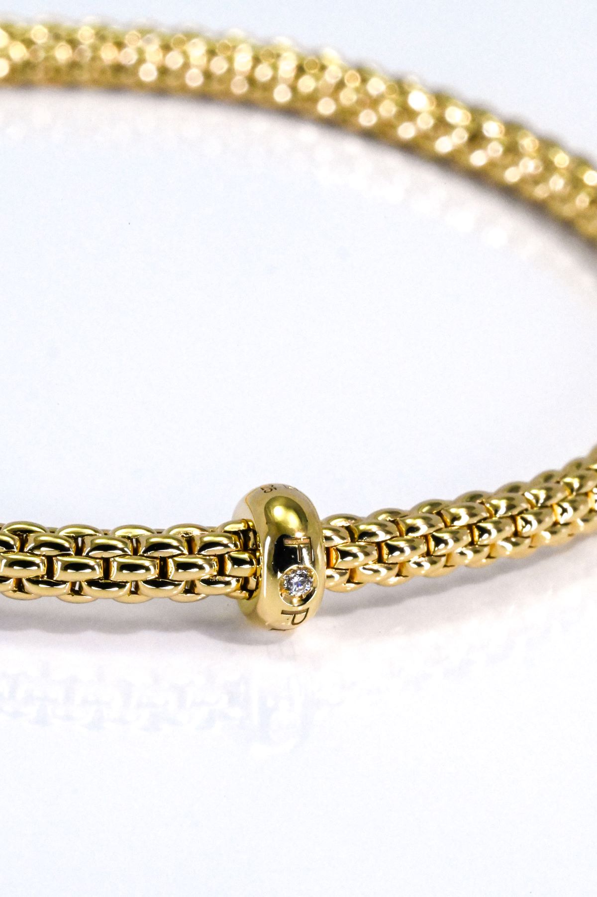 18-karat yellow gold FOPE wrist bracelet from the “Prima” collection. This flexible design features a signature woven link pattern, accented with a gold rondelle set with one round brilliant-cut natural diamond weighing 0.01 carats. Elegant, refined, and effortlessly wearable — a classic expression of FOPE’s understated luxury.