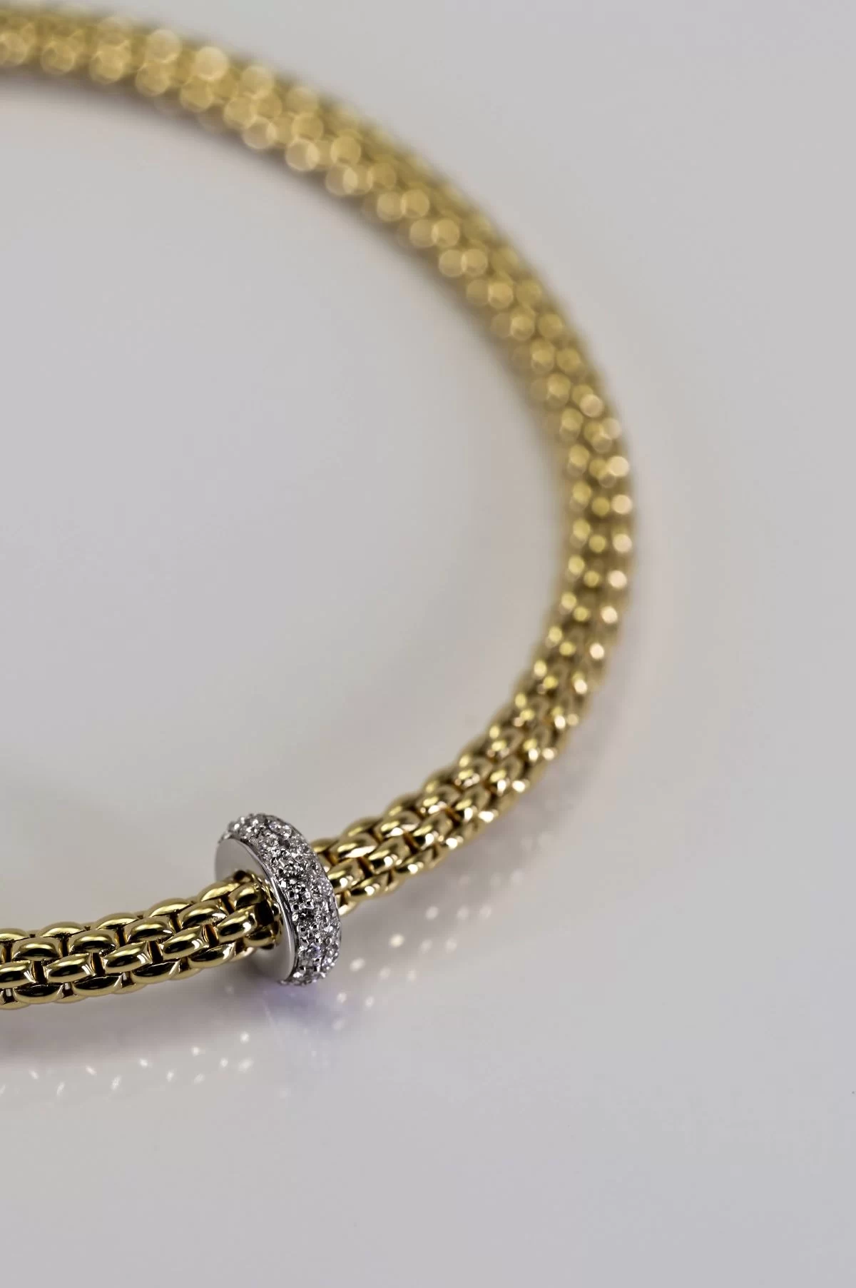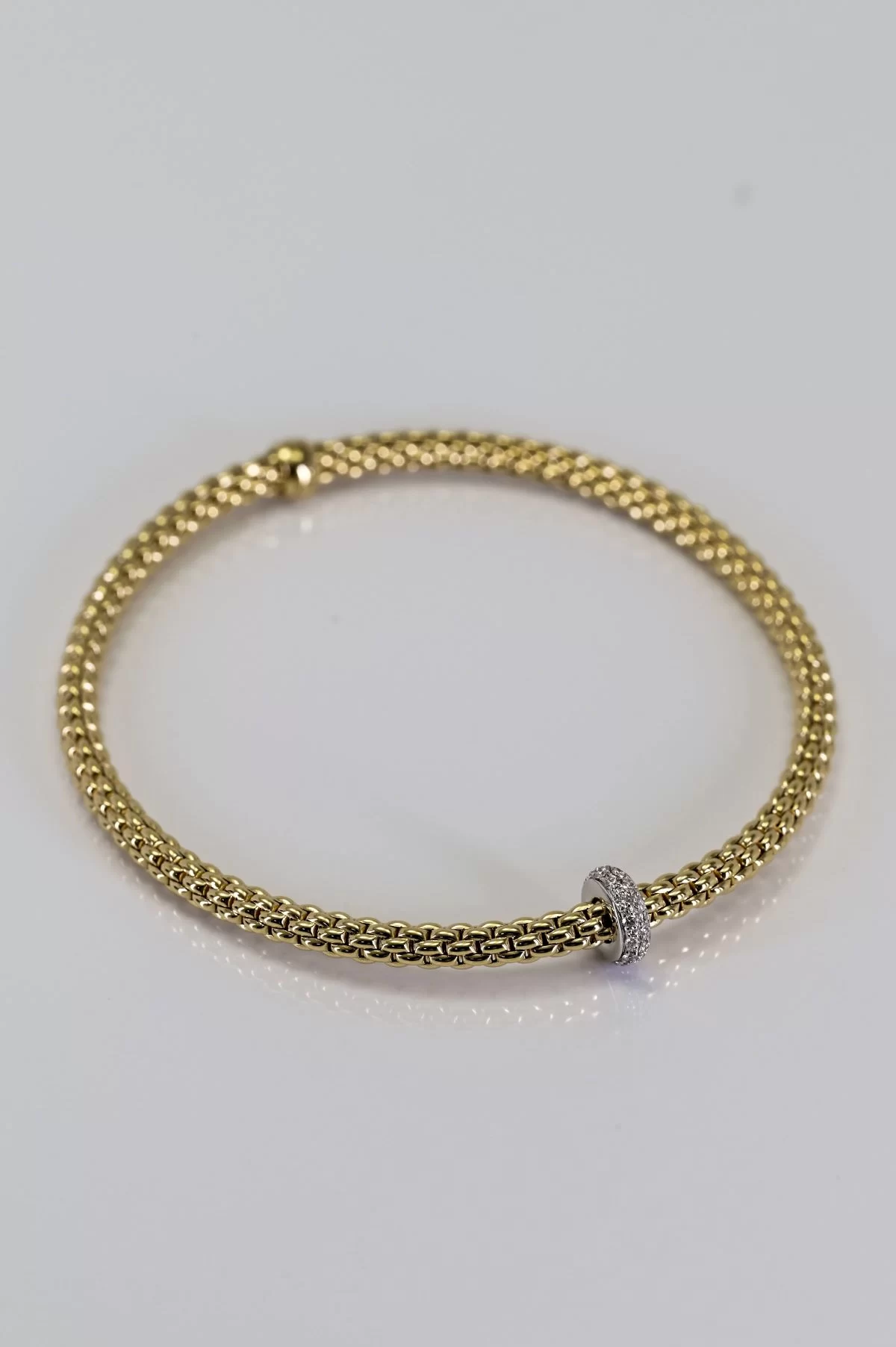 FOPE 18Kt yellow gold “PRIMA” collection expansion-link wrist bracelet, size Medium, featuring a white gold diamond-set stationary slider-style rondelle set with 0.10 cts of round brilliant-cut natural diamonds.