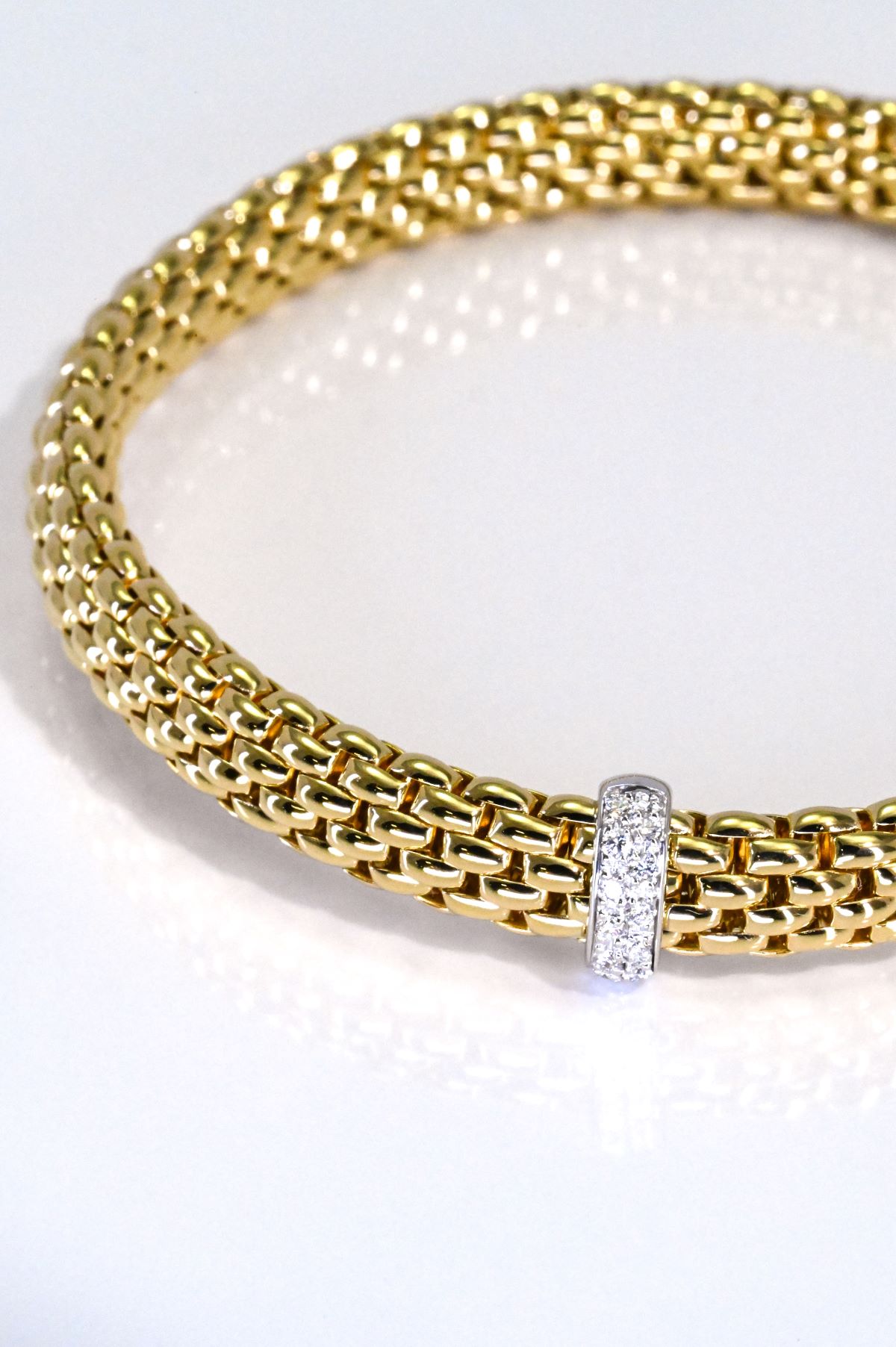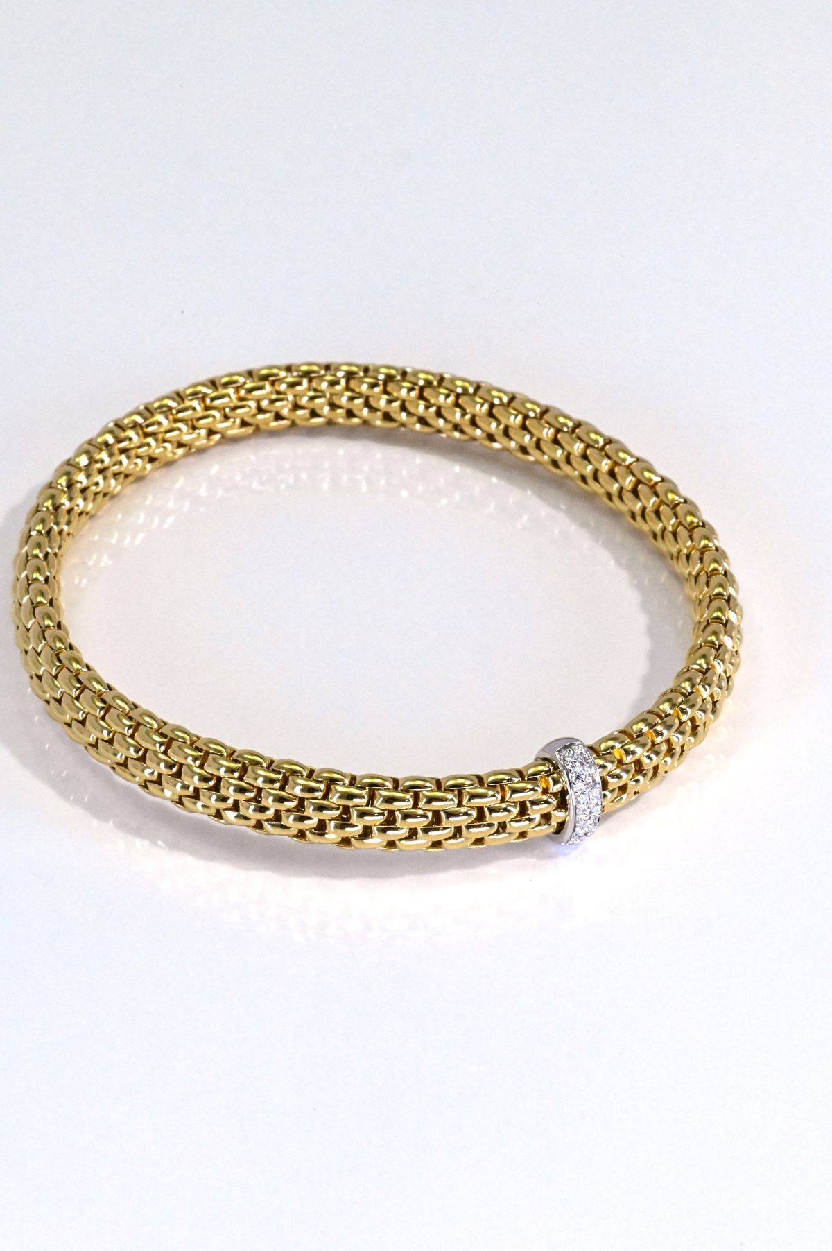 FOPE 18-karat yellow gold “Vendome” collection expansion-link wrist bracelet in size Medium. This flexible design features a white gold stationary slider-style rondelle set with 0.10 carats of round brilliant-cut natural diamonds, adding a refined touch of sparkle to the signature FOPE aesthetic.