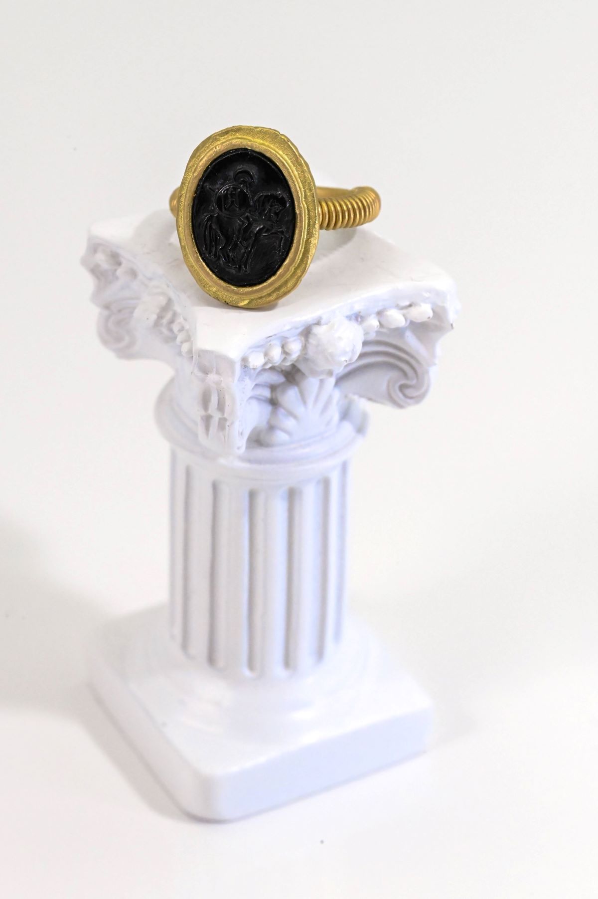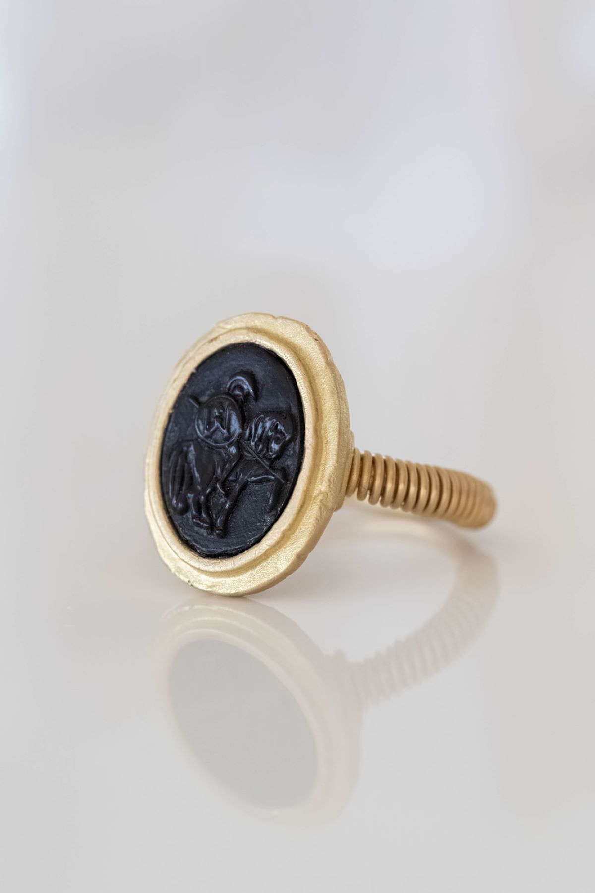 Crafted in 18-karat yellow gold, this Romanesque-style dinner ring features an oval double-bezel head with wire-wrap shoulders and a round wire shank, weighing 11.5 grams. The centerpiece is a black HyCeram insert, intricately designed in the form of a horse and soldier, set within the sculptural gold framework. With its architectural Romanesque-inspired design and meticulous craftsmanship, this ring combines historic elegance with contemporary artistry, making it a striking and distinctive statement piece.
