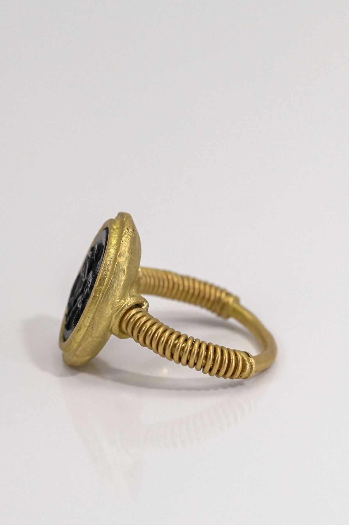 Crafted in 18-karat yellow gold, this Romanesque-style dinner ring features an oval double-bezel head with wire-wrap shoulders and a round wire shank, weighing 11.5 grams. The centerpiece is a black HyCeram insert, intricately designed in the form of a horse and soldier, set within the sculptural gold framework. With its architectural Romanesque-inspired design and meticulous craftsmanship, this ring combines historic elegance with contemporary artistry, making it a striking and distinctive statement piece.