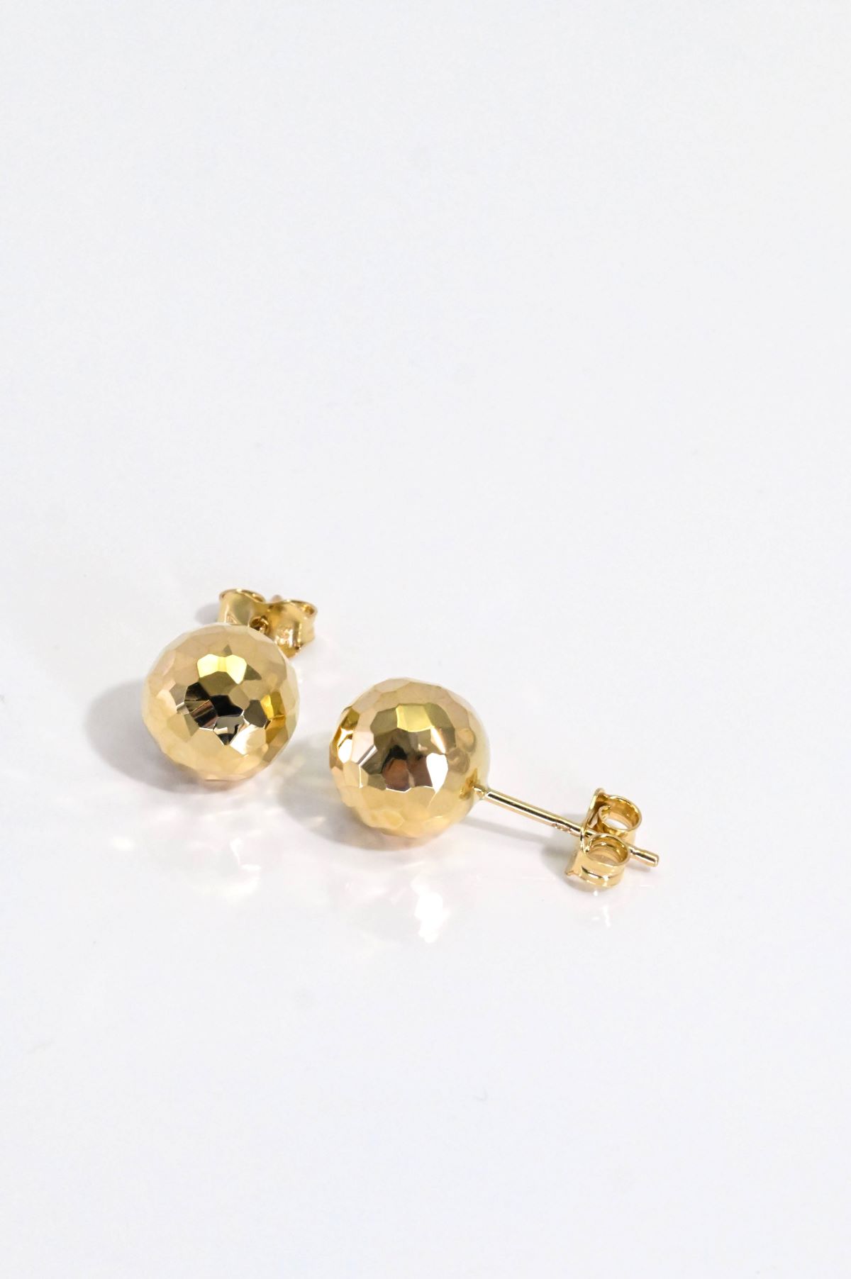 14-karat yellow gold ball stud earrings featuring 9.5 mm round hammered-finish spheres. Completed with secure post and friction backs, these bold yet classic studs offer a textured, artisan look with timeless appeal.