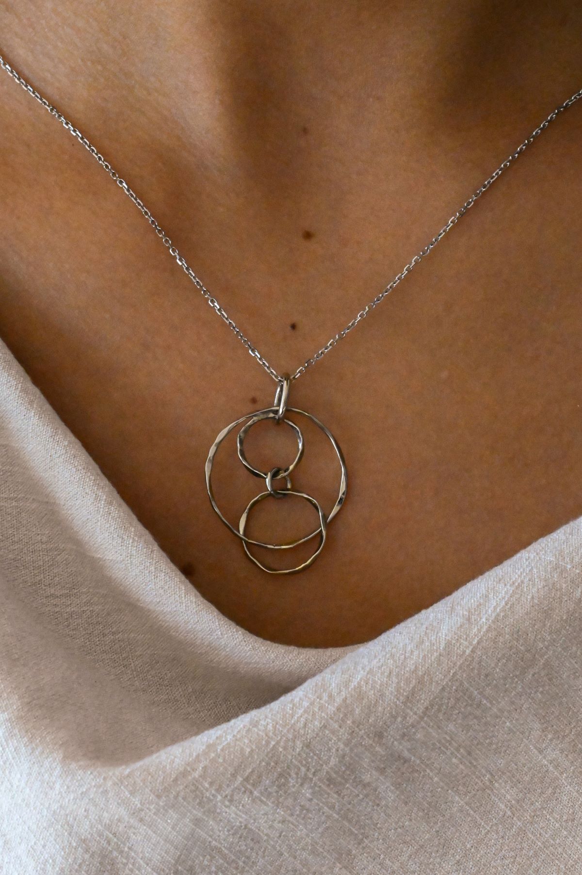 Expertly crafted by Ross Haynes, this 14 karat white gold pendant features hand-forged and hammered interlocking circles, creating a dynamic design full of texture and dimension. The artisanal craftsmanship ensures each piece is unique, highlighting the subtle reflections and organic beauty of the hammered finish. A modern yet timeless accessory, perfect for layering or wearing alone as a statement of refined elegance.
