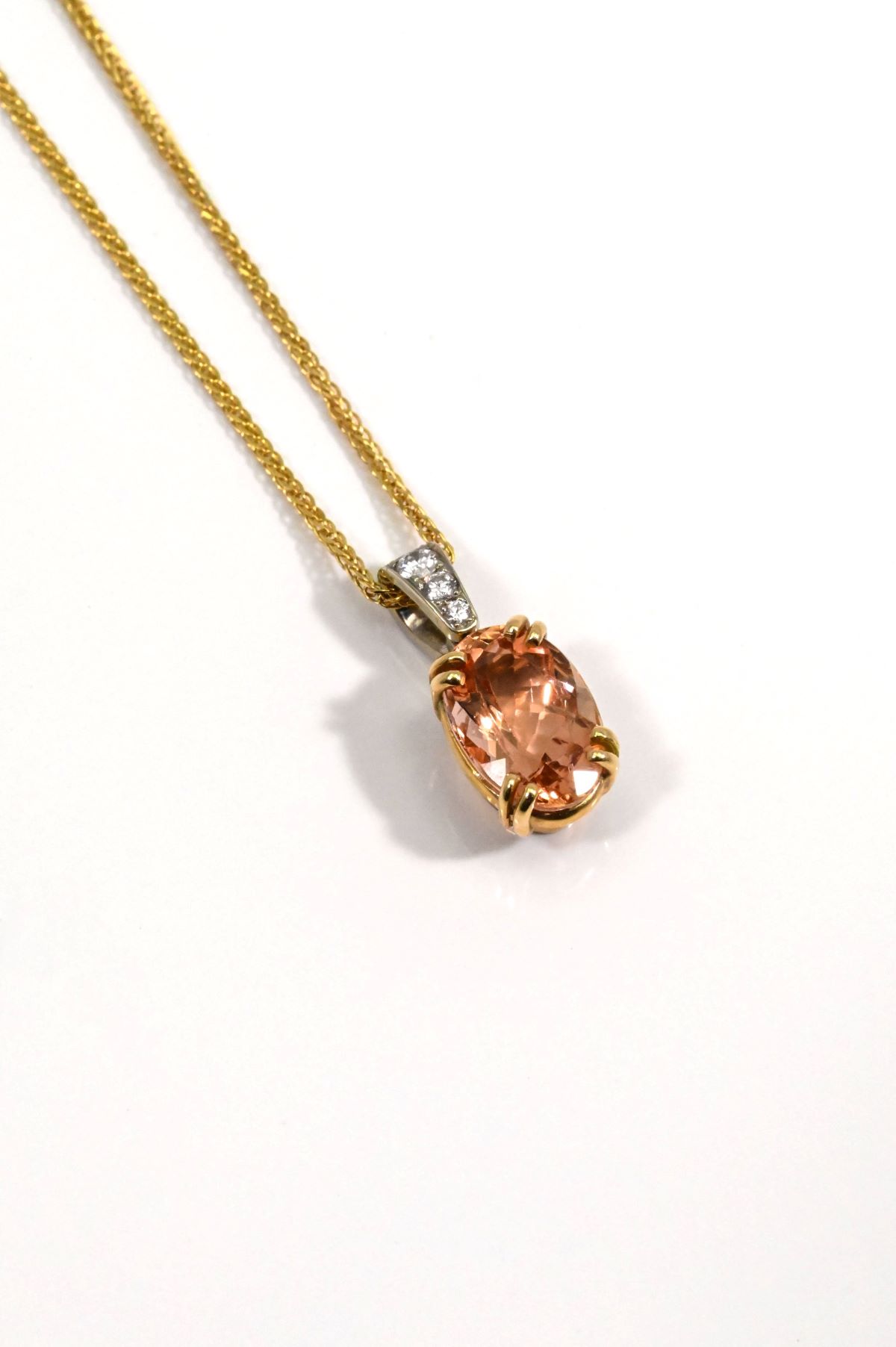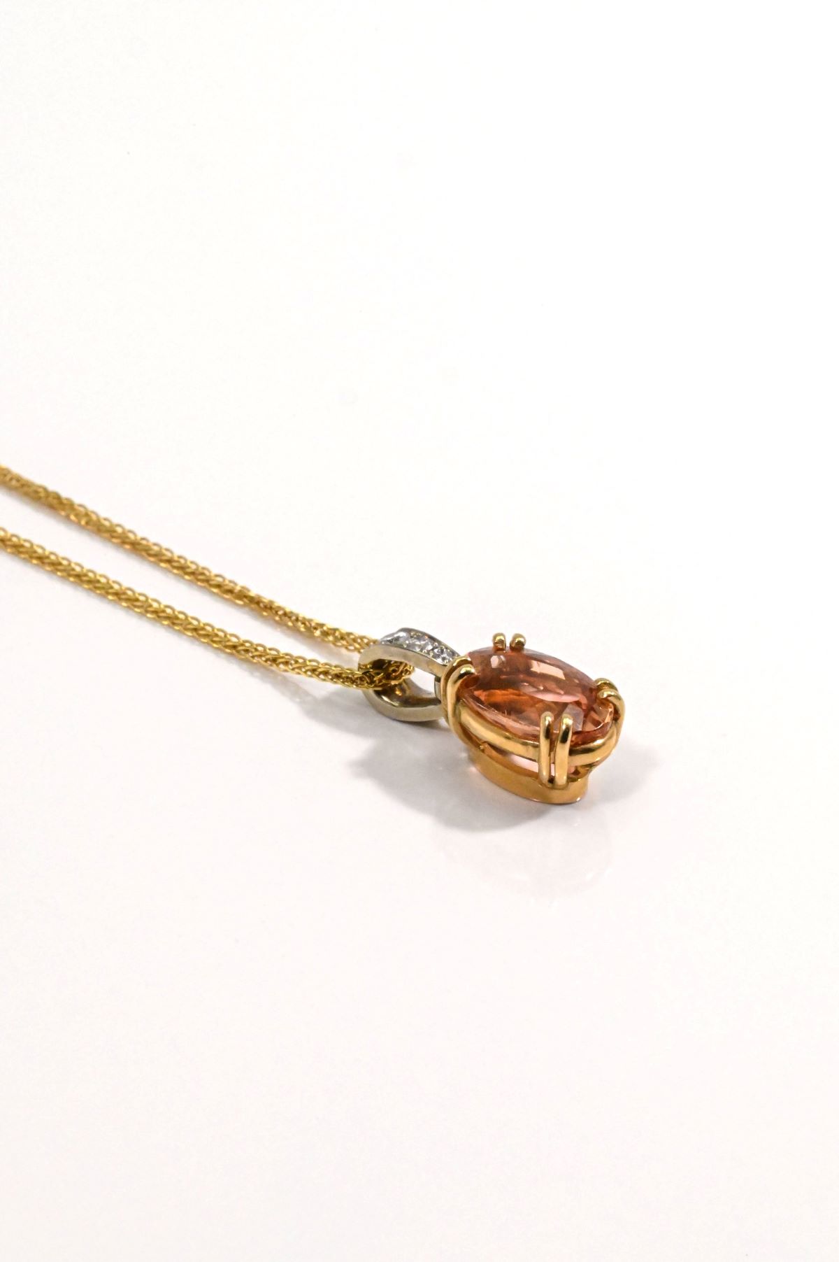 Crafted in 14K two-tone gold, this pendant features a two-level open gallery design with a diamond-set bail for added sparkle. At its center rests a 1.95-carat oval faceted fine Imperial Topaz in a rich sherry hue, complemented by 0.09 carats of round brilliant-cut diamonds, graded F/VS for exceptional quality. A refined balance of warm color and brilliance, this pendant is an elegant statement of sophistication and timeless beauty.