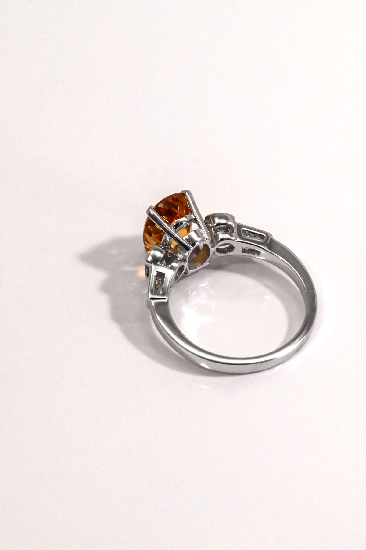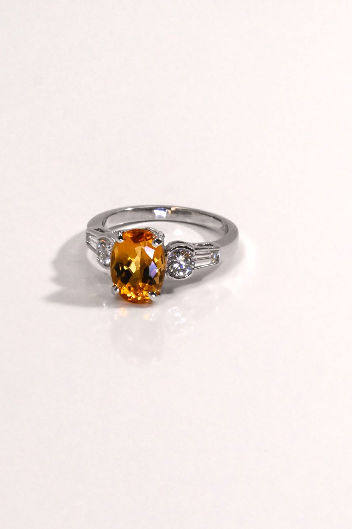 This 18k white gold ring showcases a vibrant 3.55 ct oval-shaped Imperial Topaz, held securely in a refined four-claw, two-level gallery setting. The warm brilliance of the center stone is elegantly accented by two round brilliant-cut diamonds totaling 0.50 ct and two tapered baguette diamonds totaling 0.31 ct. A timeless design with exquisite detail, this piece balances color and sparkle for an effortlessly sophisticated statement.