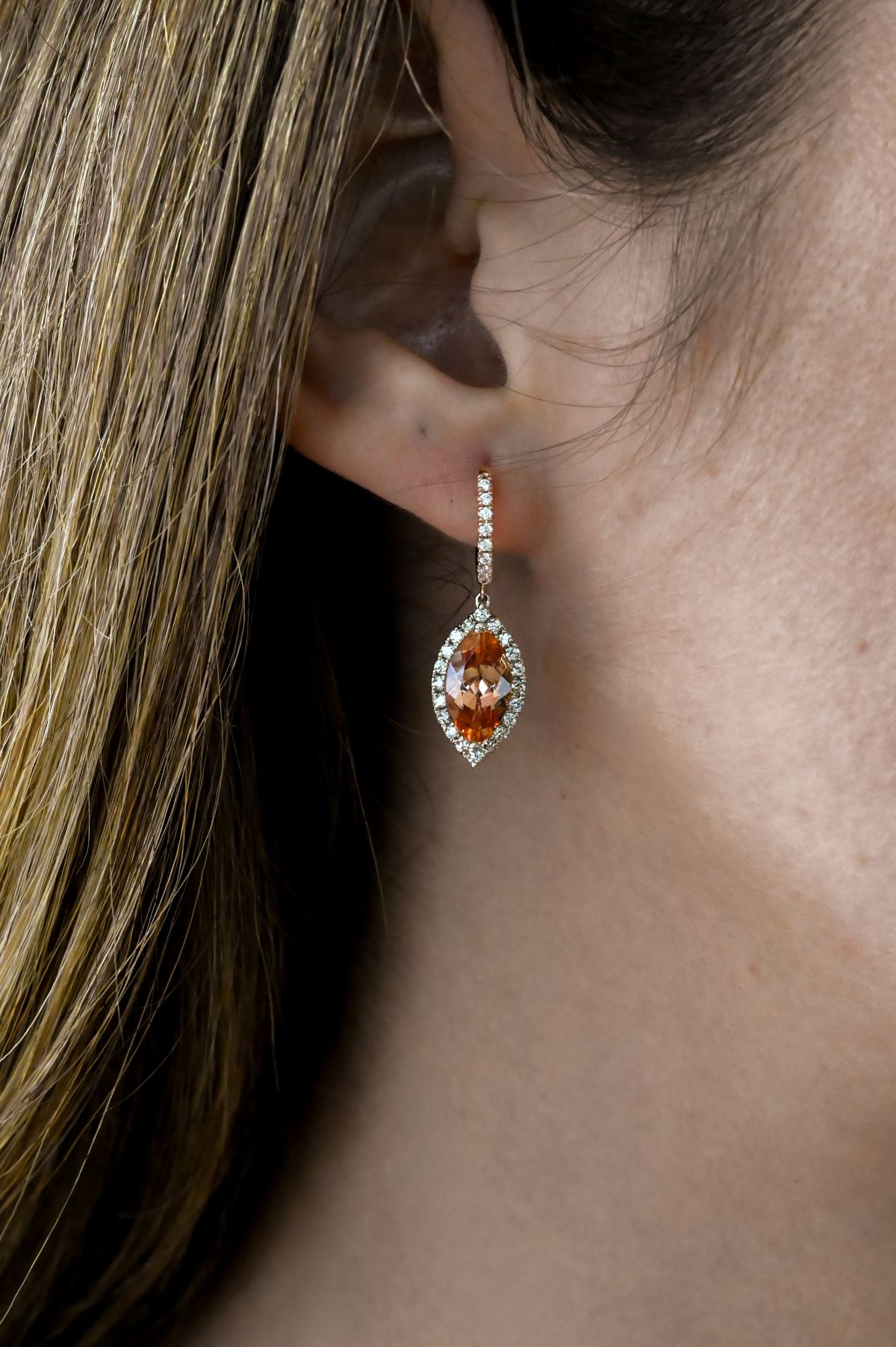Elegant drop earrings crafted in 14K rose gold and 19K white gold, featuring two marquise-cut fine Imperial Topaz (4.10ct total) in a rich sherry-golden hue. Accented with 0.40ct of VS2/F round brilliant Diamonds and finished with rose gold, diamond-set huggie-style tops for secure, graceful wear.