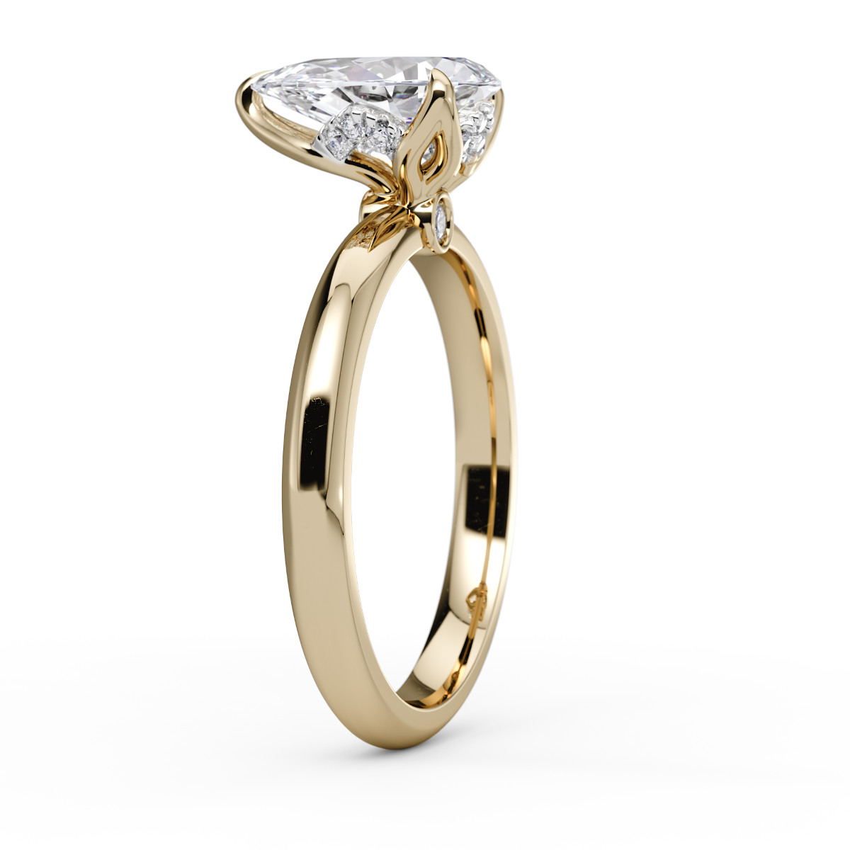 A delicate tribute to nature, this design features a graceful pear-cut diamond cradled in petal-like prongs. A sparkling hidden halo and a petite round accent stone that adds an enchanting touch, while organic curves evoke the elegance of a blooming flower. A romantic piece that feels both whimsical and timeless.