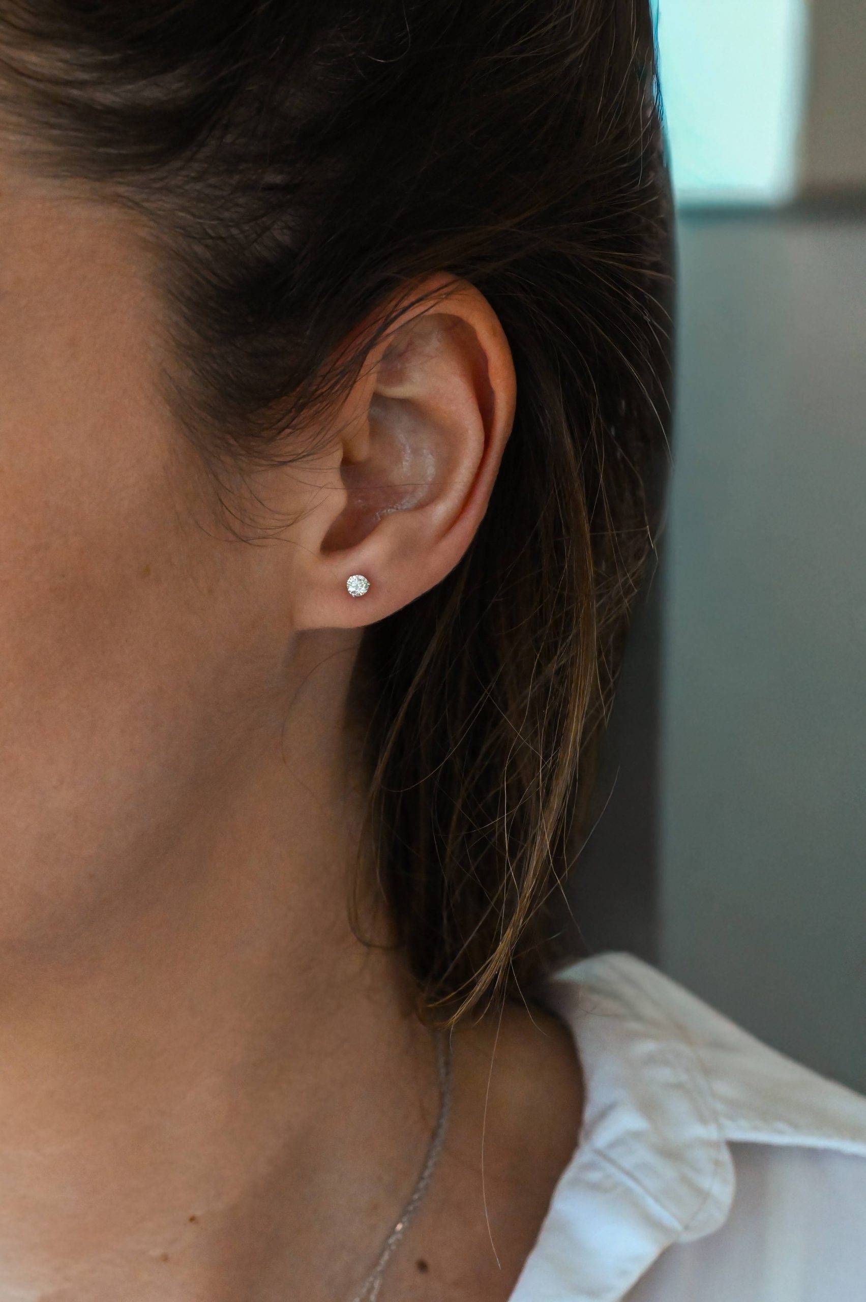 Delicate and refined, these 14Kt white gold stud earrings feature a sleek 3-claw tapered design, offering a modern twist on a classic style. Set with two round brilliant cut lab grown diamonds totaling 0.29 carats, these stones boast exceptional D/F color and VS clarity. Finished with secure butterfly backs, these earrings are perfect for effortless, everyday elegance.