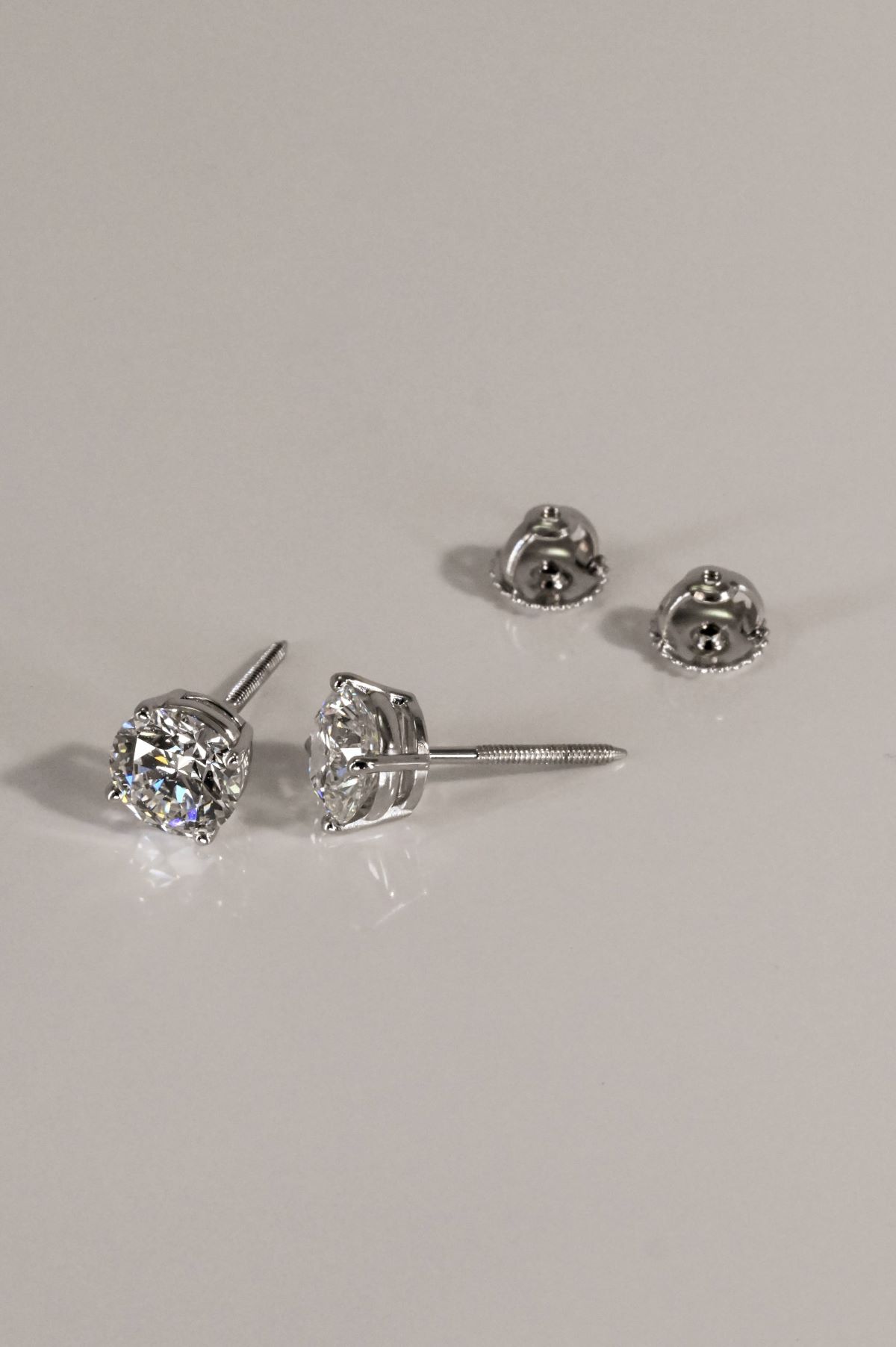 A classic pair of stud earrings in 14Kt white gold, crafted in a 4-claw, two-level open gallery setting with threaded posts and butterfly backs. Set with two round brilliant cut lab-grown diamonds totaling 2.43 carats.