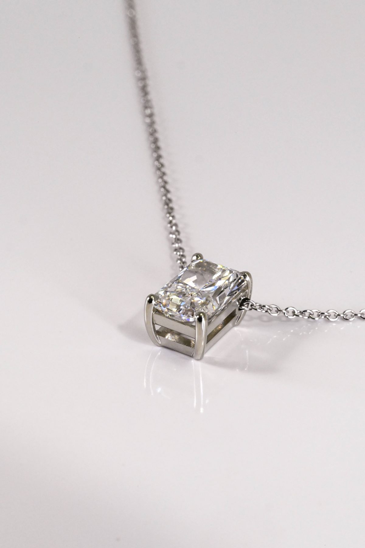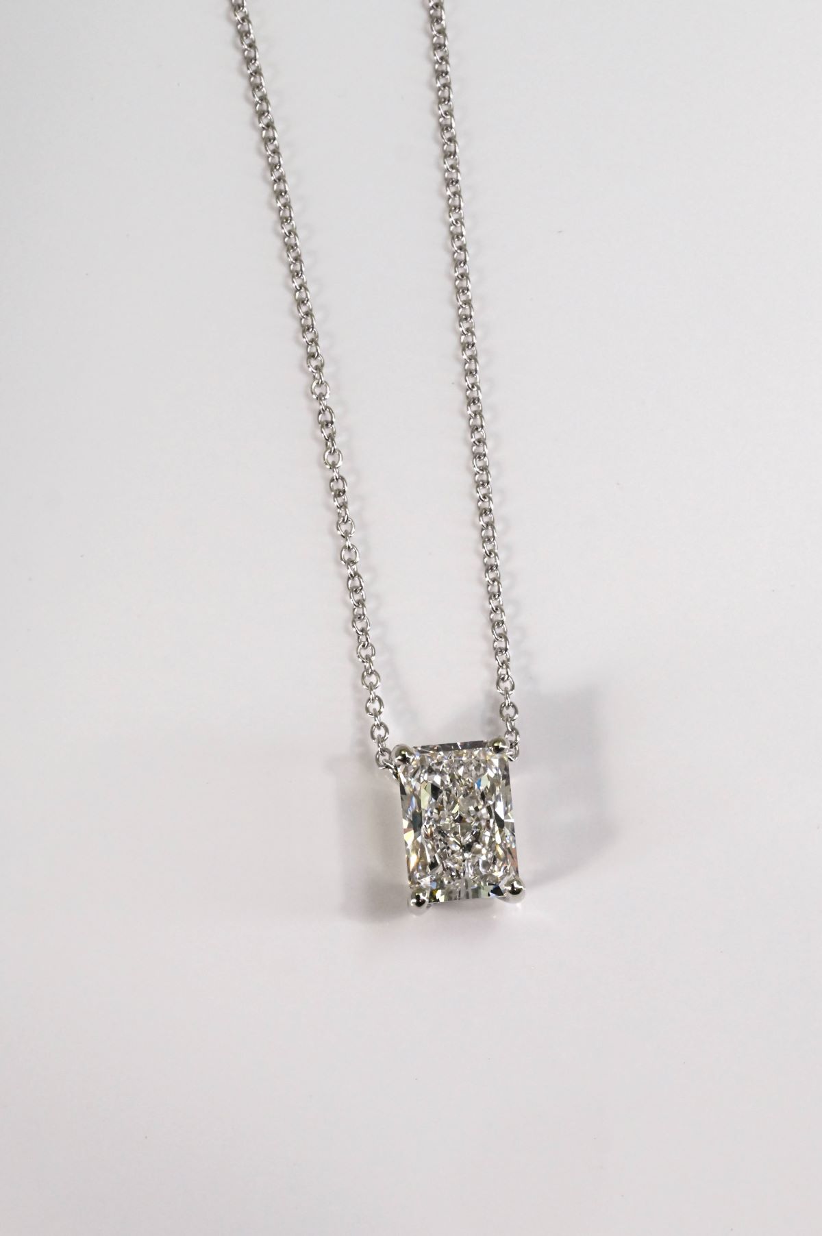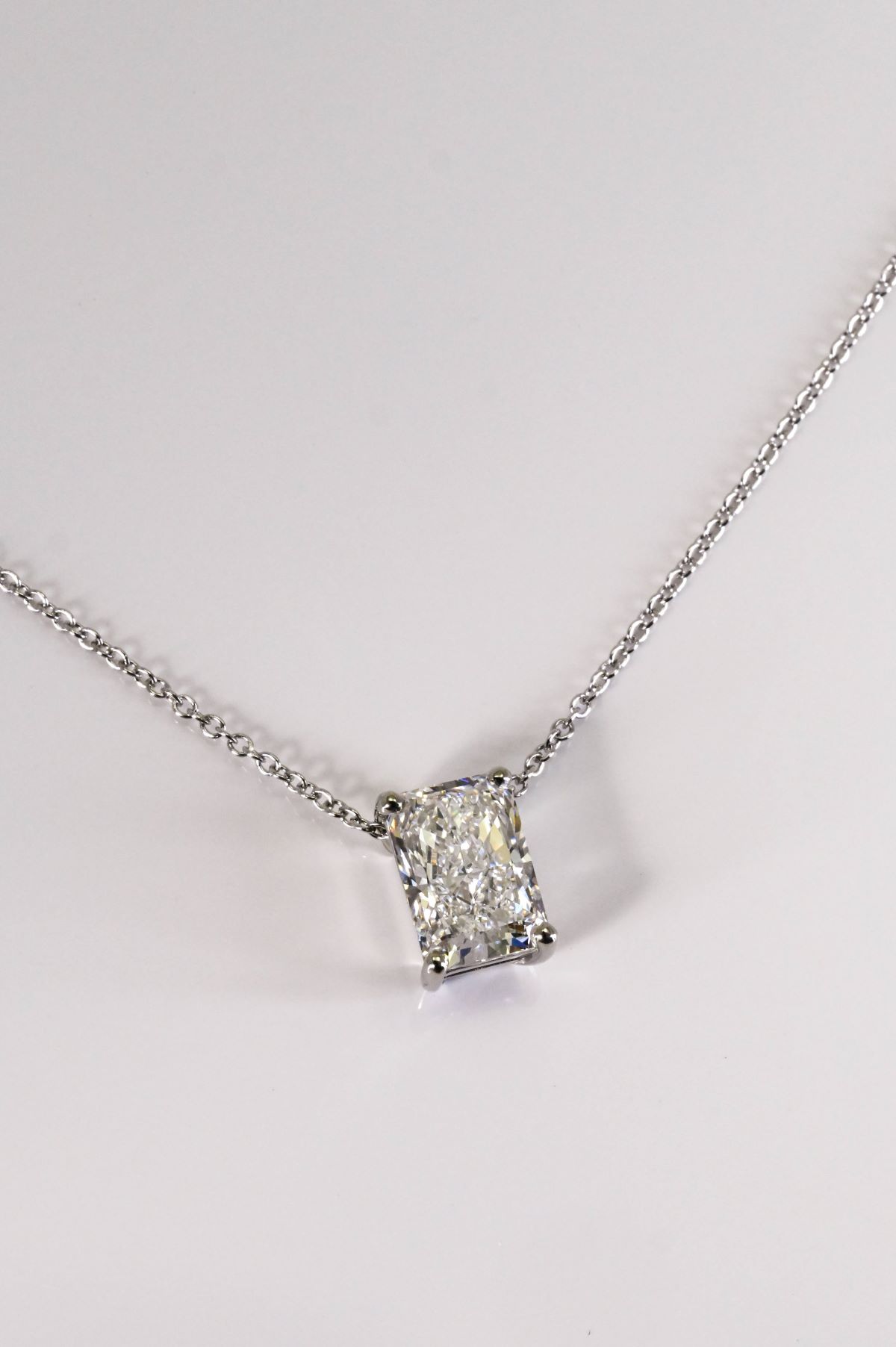 Modern simplicity meets brilliant elegance in this white gold sliding pendant, featuring a radiant cut diamond. The diamond is claw set to showcase maximum light return and suspended from an 18-inch fine open cable link chain for a graceful, floating effect. A timeless piece designed for effortless, everyday luxury.