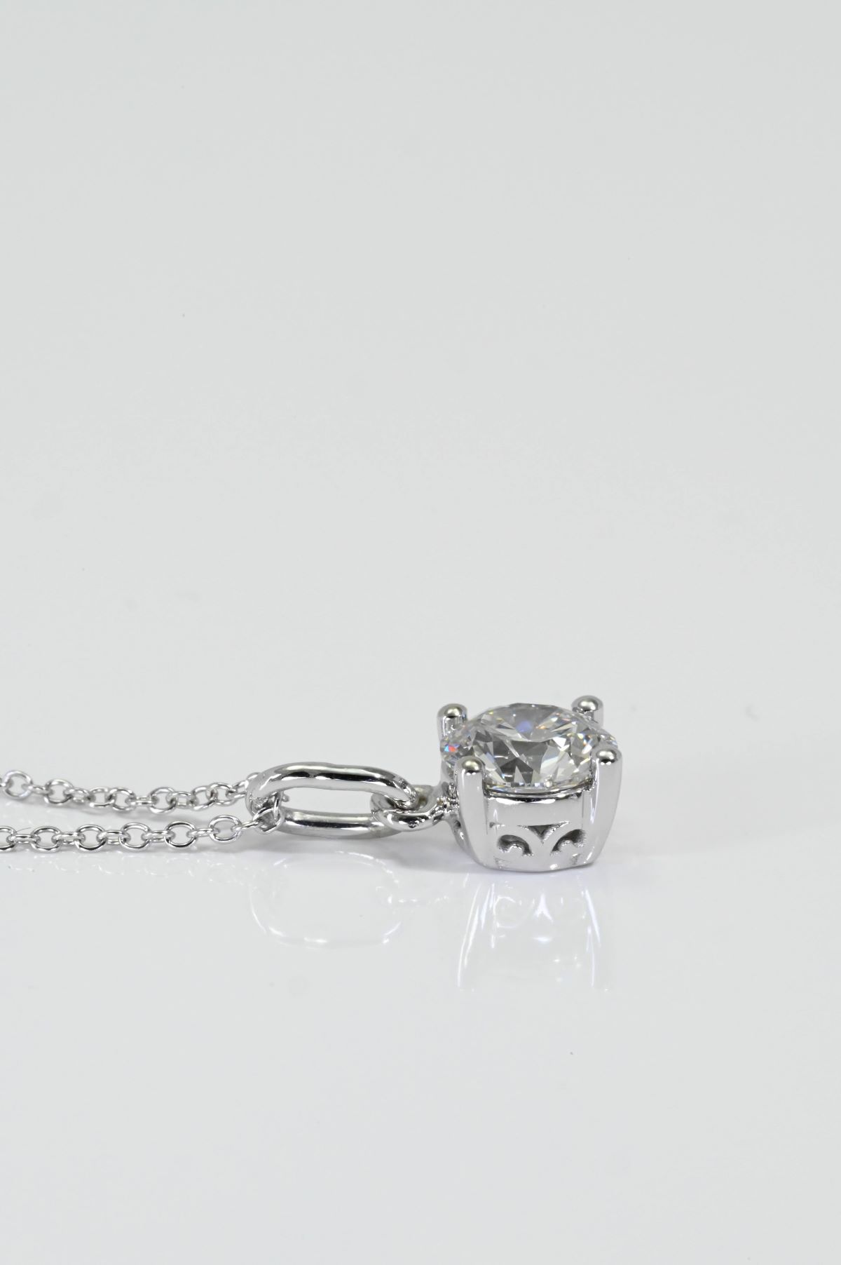 A timeless solitaire pendant crafted in rich 14 karat white gold. The design features a classic four prong setting showcasing a 1.04 carat ideal cut round brilliant lab grown diamond, graded E colour and VS1 clarity. Elegant and refined, this pendant highlights exceptional brilliance with a clean, sophisticated silhouette.