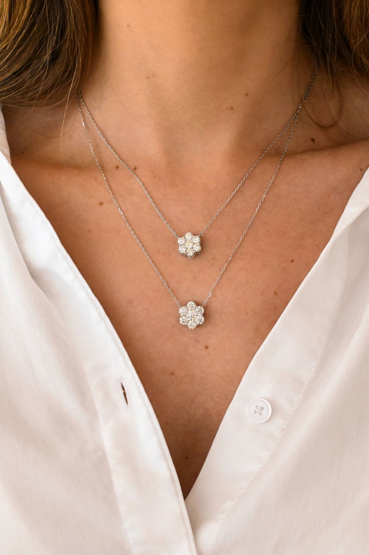 This 14k white gold necklace features a seven-stone lab-grown diamond cluster, totaling 1.99 ct of round brilliant-cut diamonds with D color and VS1 clarity. Suspended from an 18-inch anchor link chain in 14k white gold, it offers modern elegance and sustainable luxury, making it a dazzling statement piece for any occasion.
