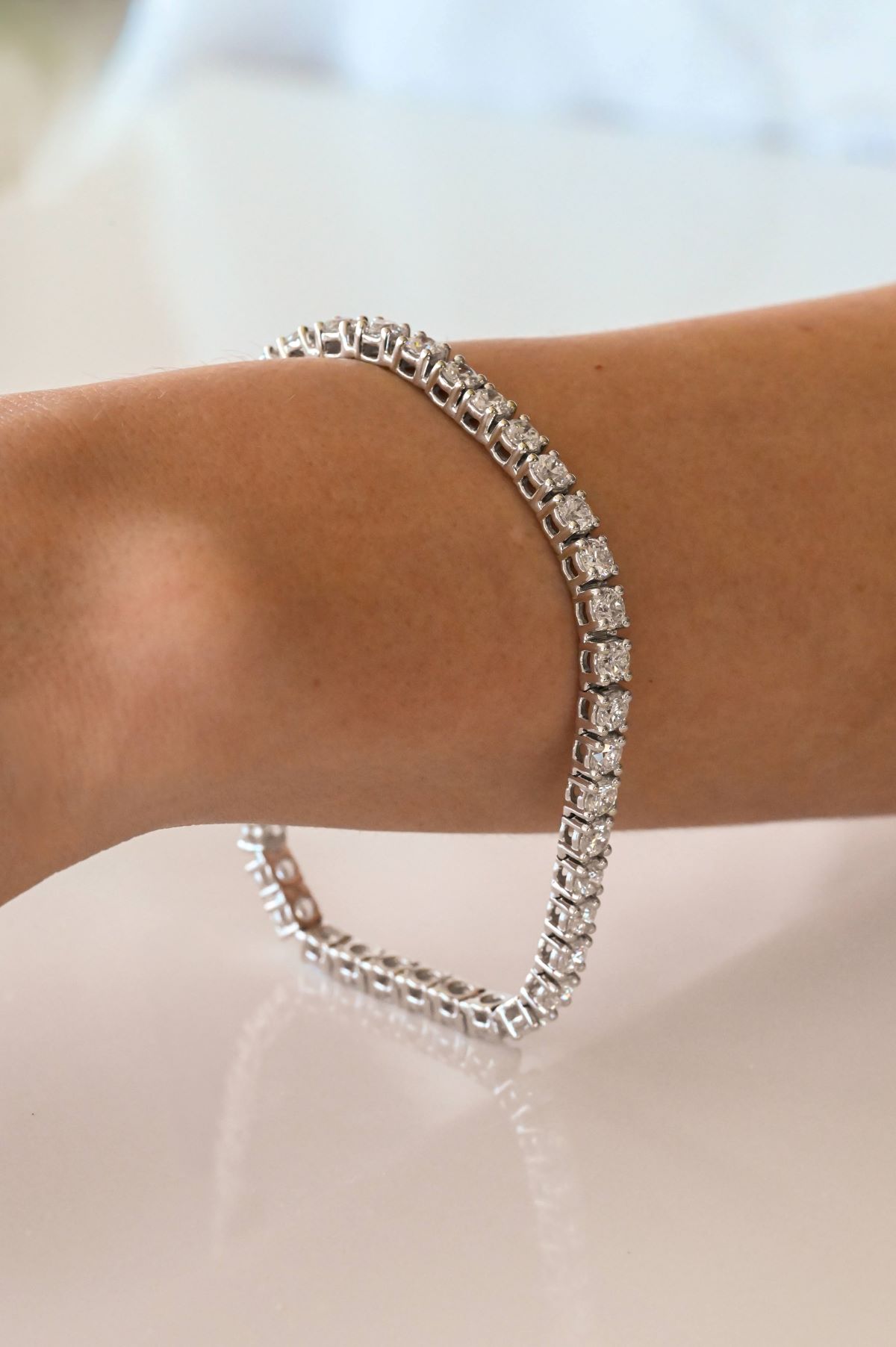A timeless classic reimagined, this 14K white gold tennis bracelet features lab-grown diamonds totaling 10.01 carats. Each round brilliant diamond is graded D–F in colour and VS in clarity, offering exceptional sparkle and purity. Elegant, ethical, and endlessly radiant.