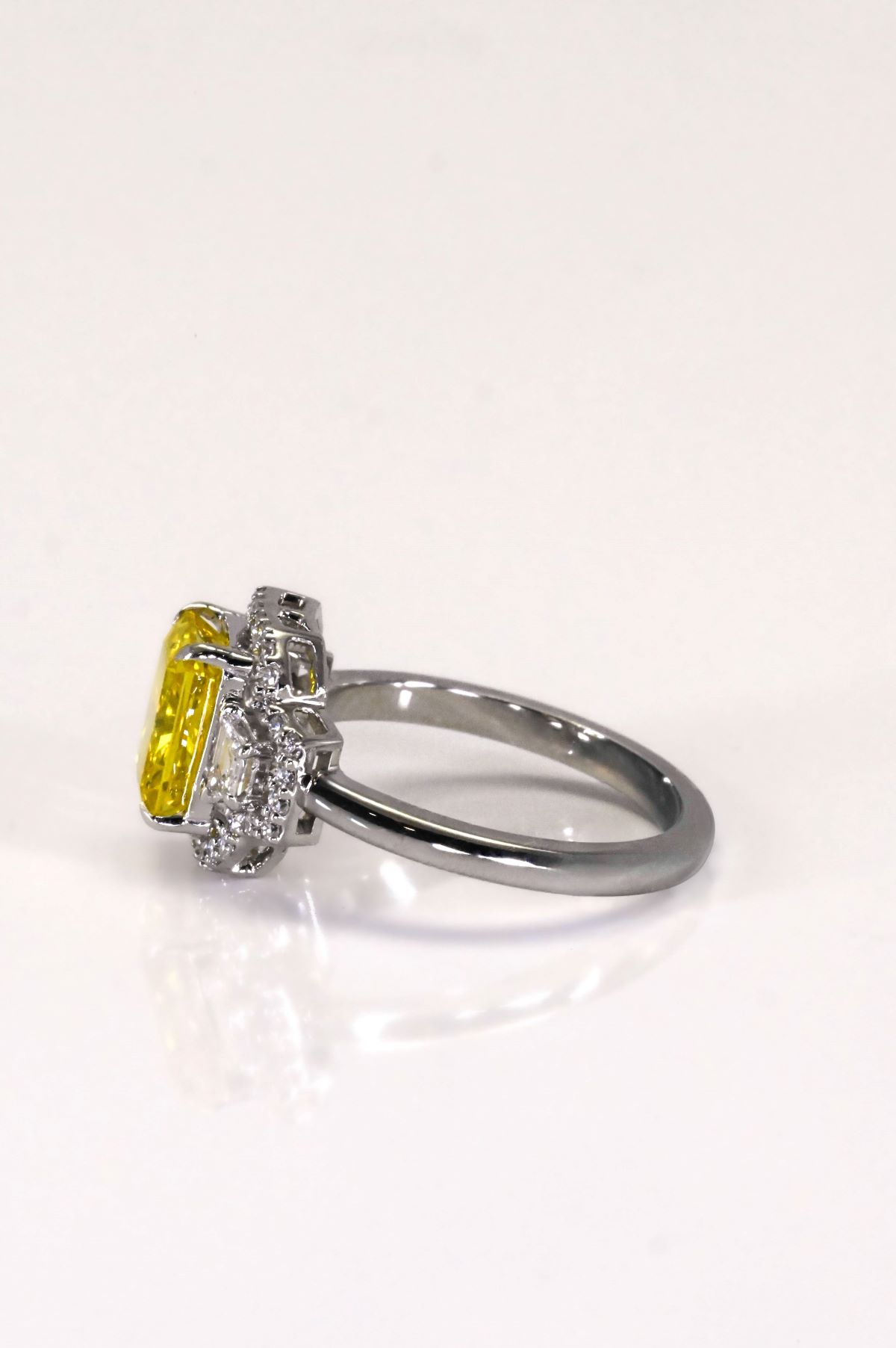 A striking white-gold dinner ring featuring a half-round band set with two trap step-cut lab-grown brown diamonds and a rectangular four-claw center setting. The centerpiece is a vivid 1.88 ct lab-grown rectangular cushion radiant-cut yellow diamond, framed by a fitted halo of 36 round brilliant lab-grown diamonds totalling 0.37 ct. Bold color contrast, refined geometry, and exceptional sparkle create a dramatic yet elegant statement piece.