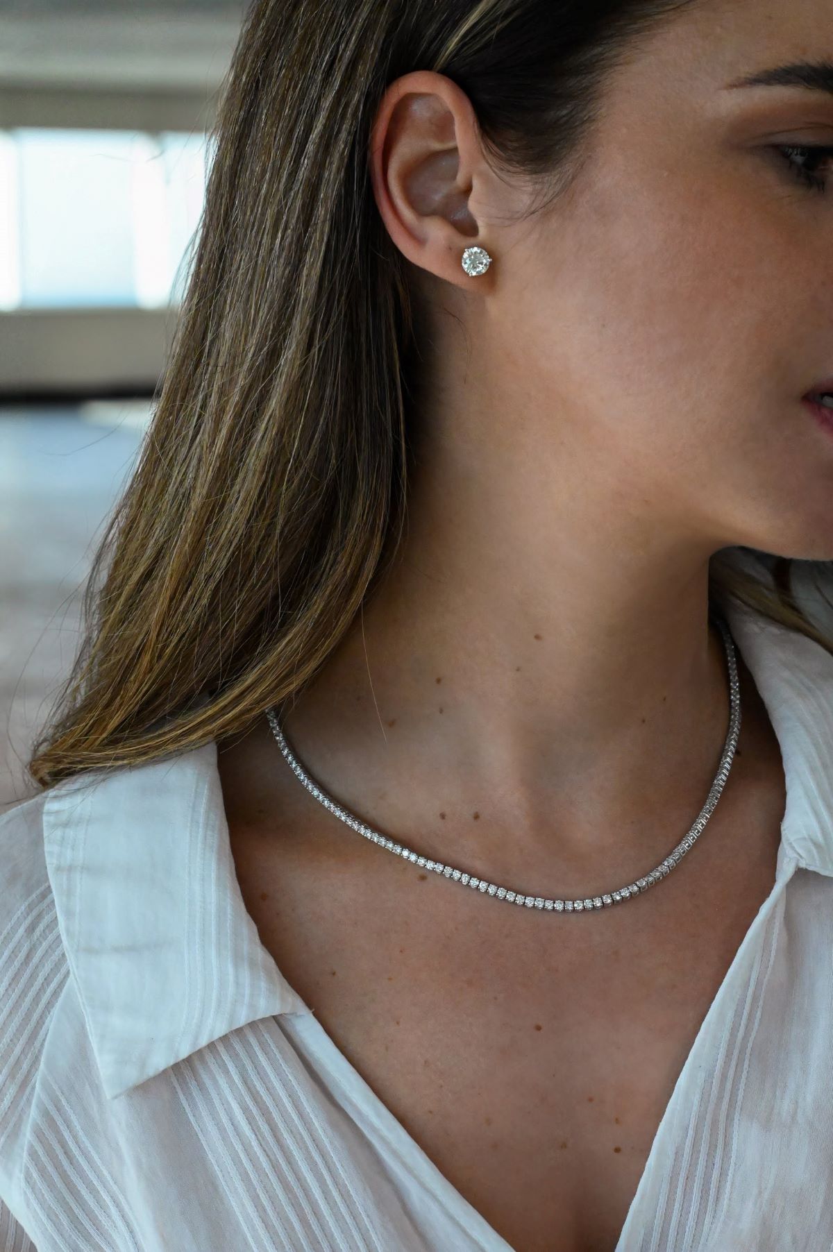 Radiating elegance, this 14K white gold tennis-style necklace spans 17.5 inches and features 10.14 carats total weight of round brilliant-cut lab-grown diamonds (VS clarity, G+ colour). Each diamond is expertly set in classic four-claw, two-level settings, enhancing their brilliance and fire. Finished with a sleek high-polish shine, an inline box clasp, and a figure-eight safety clasp, this necklace is the ultimate expression of modern luxury and timeless sophistication.