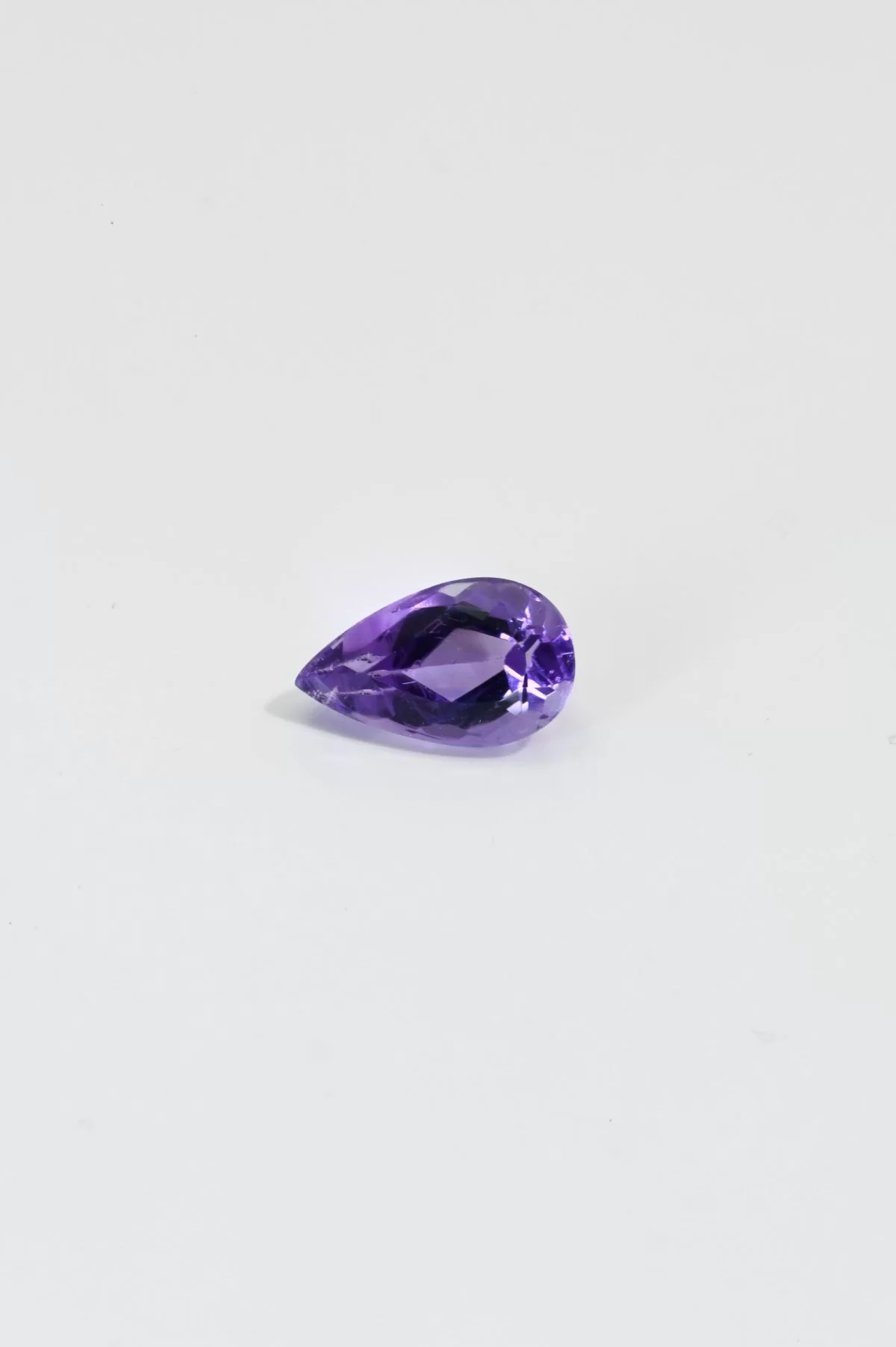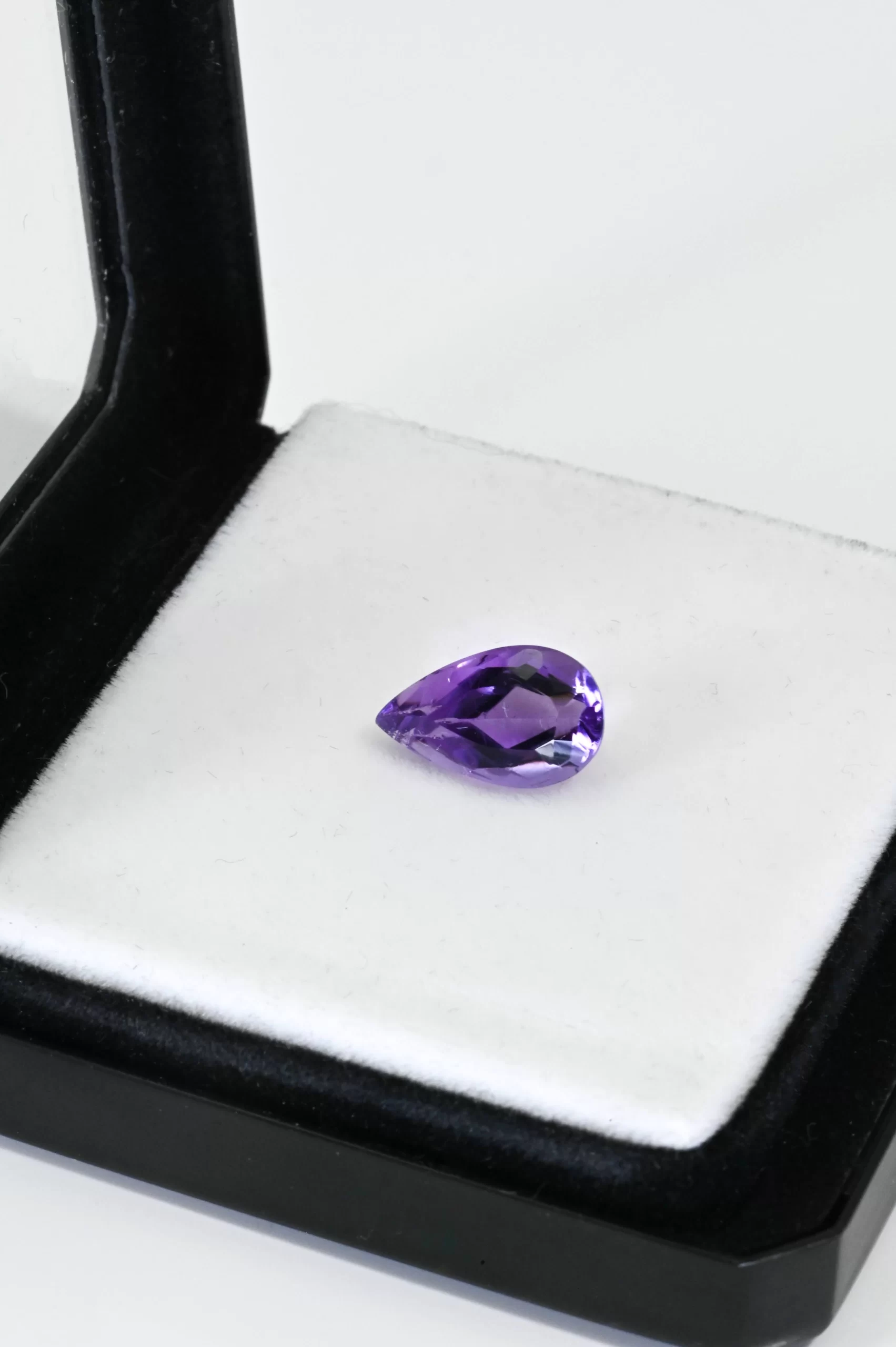 A beautiful loose amethyst featuring an elegant pear shape, weighing 3.41 carats and measuring 12.6 by 7.6 millimetres. Rich in colour and graceful in form, this gemstone offers lovely brilliance and fluid shape. Refined and versatile, it is an excellent choice for a bespoke jewellery design or a distinctive addition to any gemstone collection.