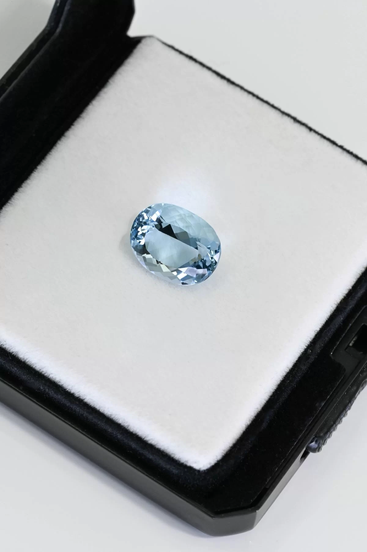 A refined loose aquamarine featuring an elegant oval faceted cut, weighing 4.72 carats. Displaying a medium dark colour, this gemstone offers serene depth and luminous clarity with a cool, oceanic tone. Sophisticated and versatile, it is an ideal choice for a bespoke jewellery creation or a distinguished addition to any gemstone collection.