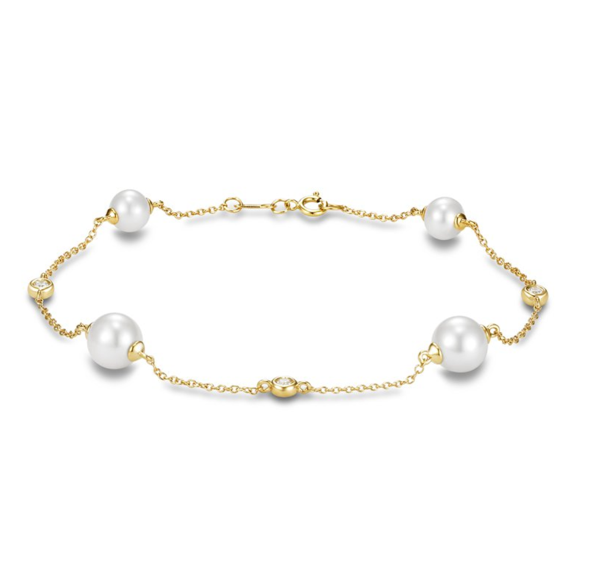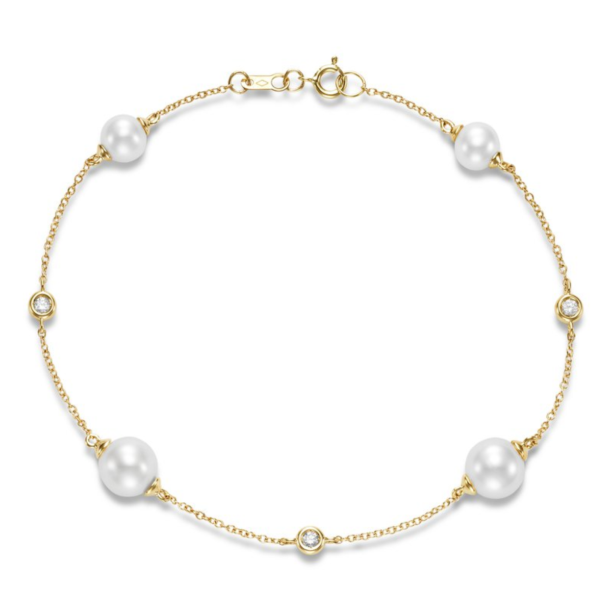 Delicate sophistication defines this 7.5-inch bracelet by Mastoloni, crafted in fine 14K yellow gold with a graceful rolo link design. Alternating freshwater pearls—two large and two small—are set in elegant gold cups, interspersed with three bezel-set natural diamonds totaling 0.08 carats. A refined blend of classic pearls and sparkling diamonds, perfect for elevating any look.