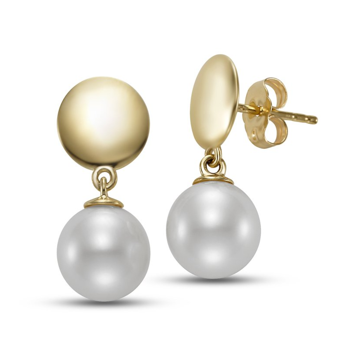 Crafted in warm 14 karat yellow gold, these ladies’ earrings feature a graceful drop design suspended from polished round disc studs with secure posts and butterfly backs. Each earring is set with a lustrous 8.5–9mm round cultured freshwater pearl, offering timeless beauty and understated elegance for any occasion.
