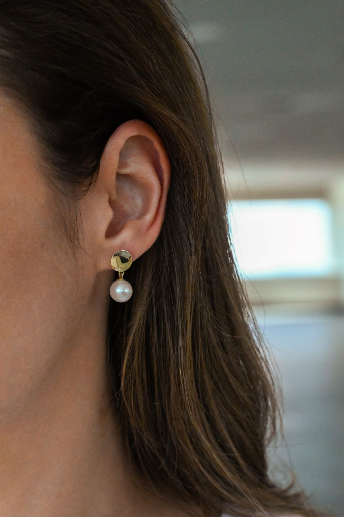 Crafted in warm 14 karat yellow gold, these ladies’ earrings feature a graceful drop design suspended from polished round disc studs with secure posts and butterfly backs. Each earring is set with a lustrous 8.5–9mm round cultured freshwater pearl, offering timeless beauty and understated elegance for any occasion.