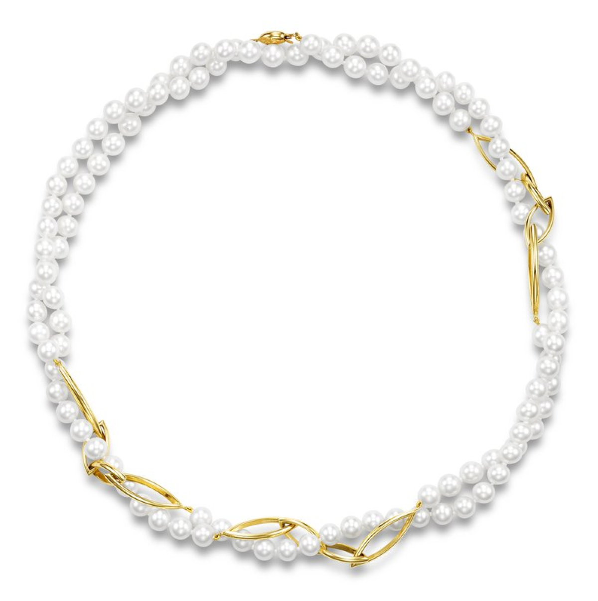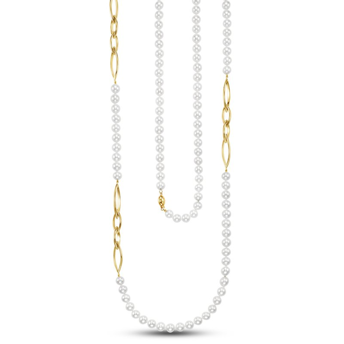 This Mastoloni ladies’ freshwater pearl necklace measures 44 inches in total length and features lustrous round cultured pearls. Highlighted with three sections of large navette-shaped 14k yellow gold links and finished with a matching pearl clasp, it offers a sophisticated blend of classic elegance and modern design, perfect for layering or wearing as a statement piece.