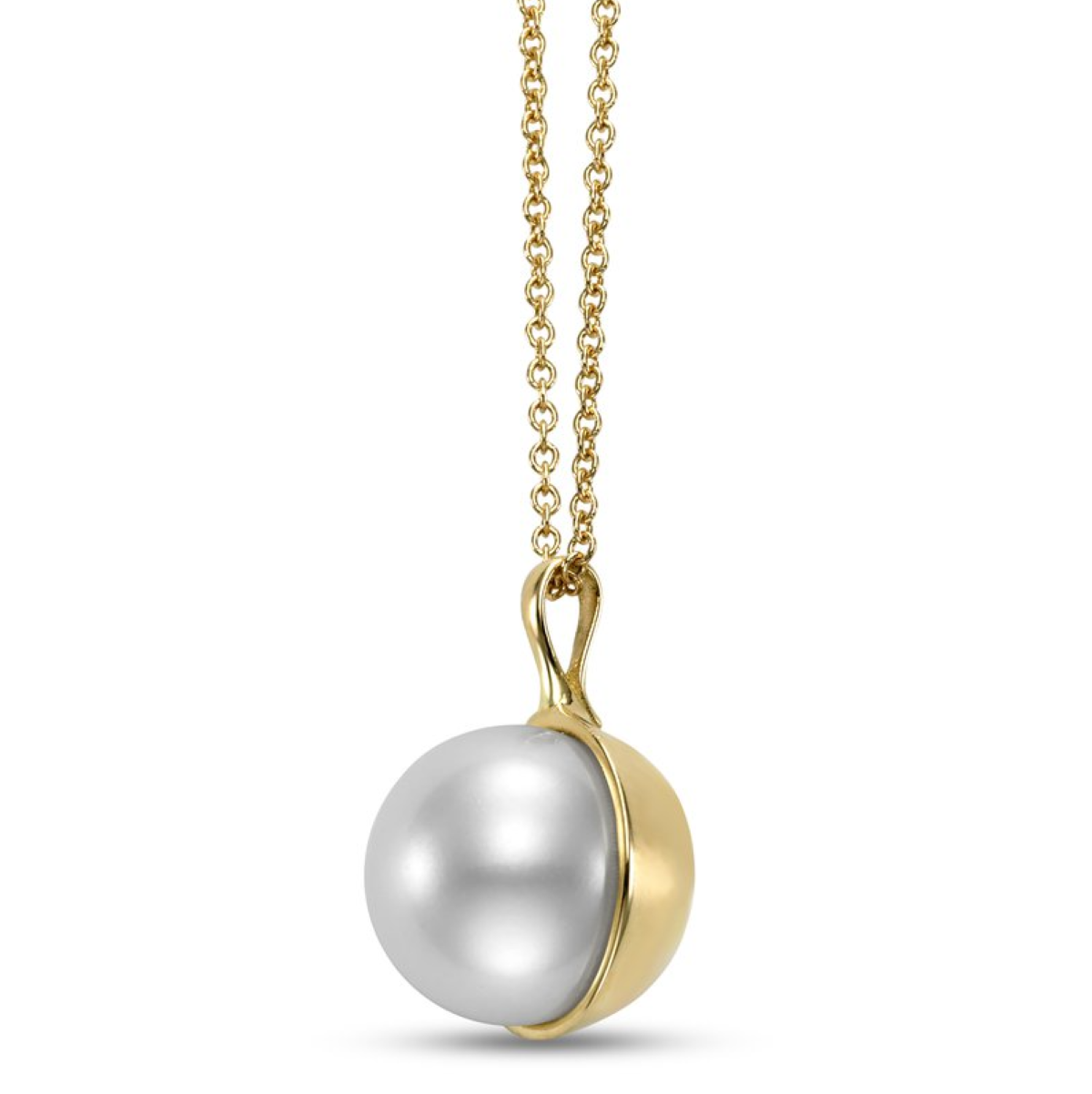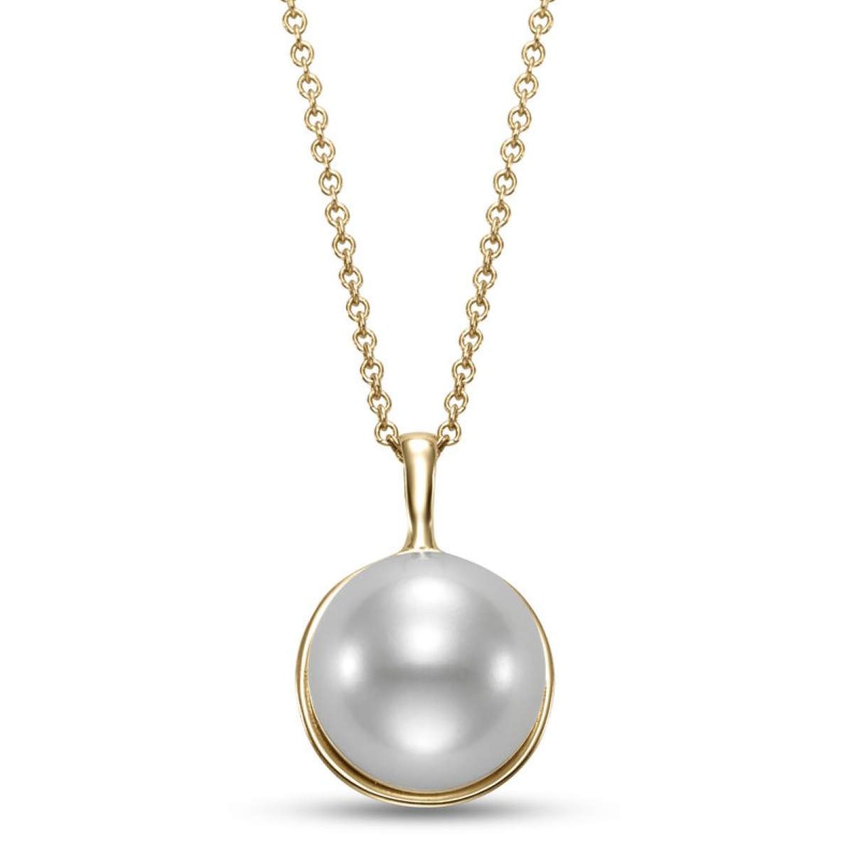 This Mastolini pendant showcases a luminous 10.5–11 mm round cultured freshwater pearl, cup-set to highlight its natural glow and elegance. Suspended from an 18-inch fine Rolo link chain with an attached bail, the design combines classic sophistication with understated refinement, creating a timeless piece that exudes grace and versatility.
