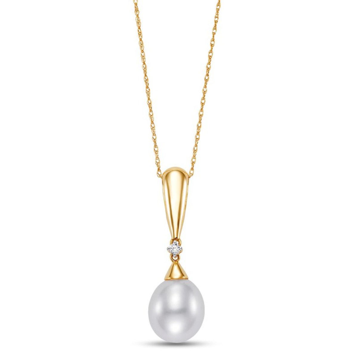 This Mastolini pendant features a 9.5–10 mm oval freshwater pearl, complemented by a single 0.03-carat round brilliant natural diamond for a touch of subtle sparkle. Set with a polished elongated bail on a 14-karat yellow gold superfine Rolo link chain measuring 18 inches with a 2-inch station, the design combines classic elegance with delicate modern refinement, creating a versatile piece that radiates timeless sophistication.