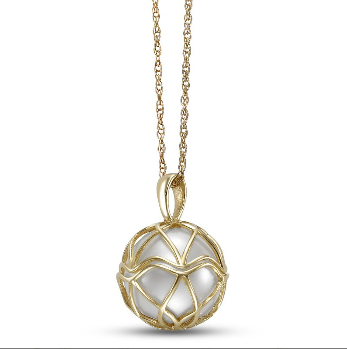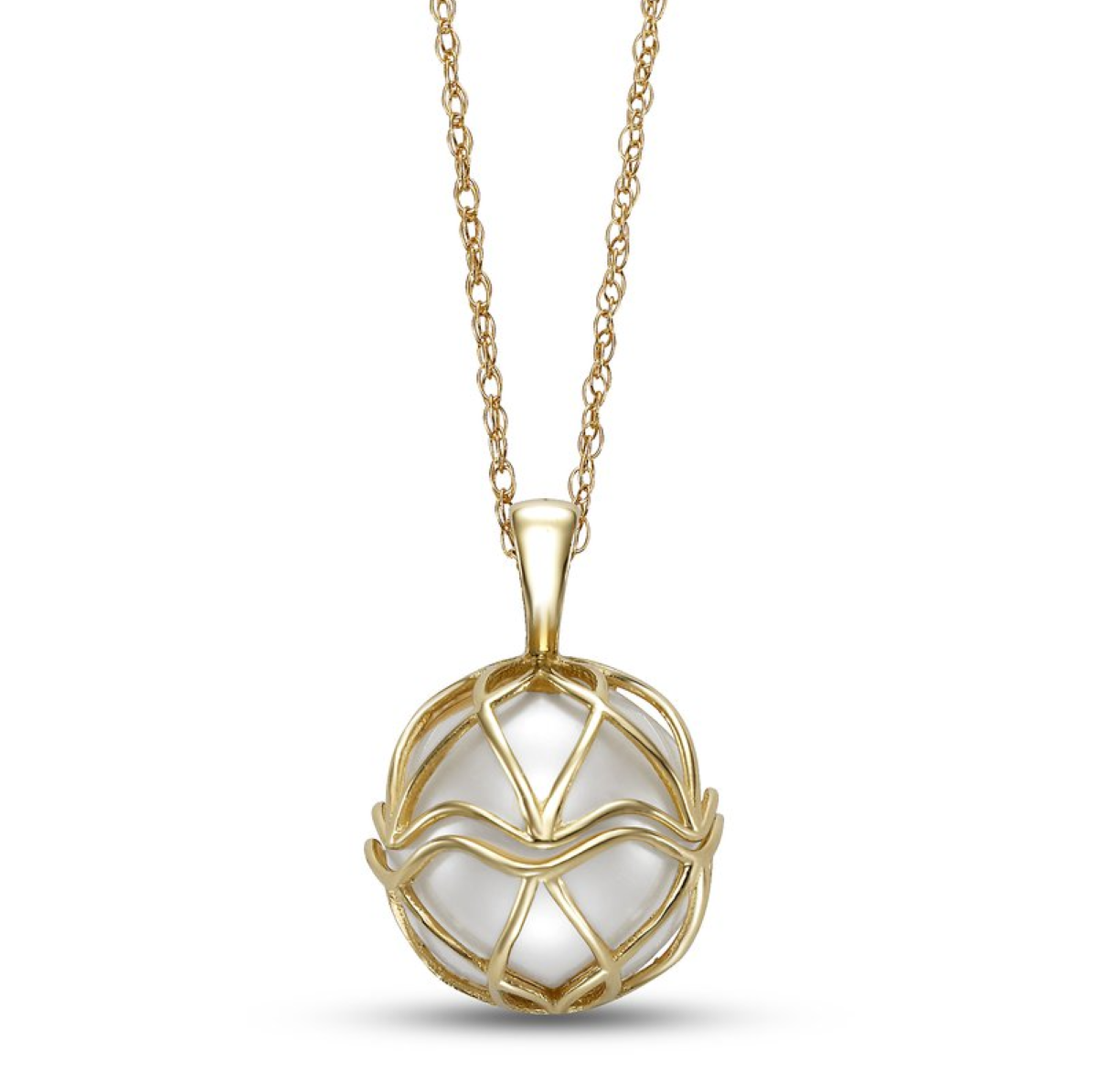 This Mastolini “Cage” pendant features a 10–10.5 mm round cultured freshwater pearl, elegantly suspended within a delicate yellow gold cage. Paired with an 18-inch fine Rolo link chain and an attached “V” bail, the design balances contemporary structure with classic elegance, creating a sophisticated and versatile piece that showcases the natural beauty and luster of the pearl.