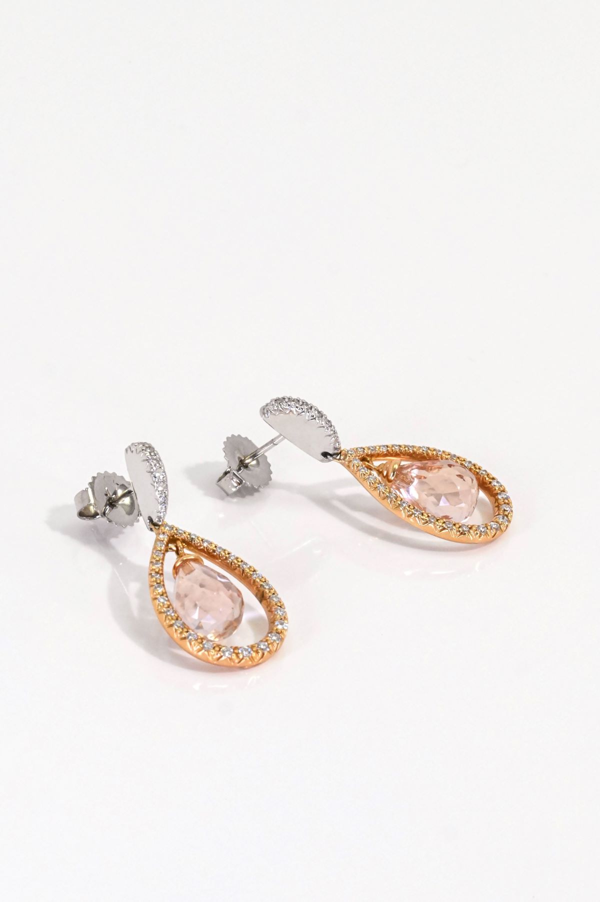 These elegant drop earrings feature briolette-cut Morganites with a total weight of 6.40 carats, radiating soft blush tones that catch the light with every movement. Accented by 0.38 carats of sparkling diamonds, the design is crafted in 18K rose and white gold for a refined two-tone finish. Romantic and graceful, these earrings are a perfect balance of color, brilliance, and timeless sophistication.