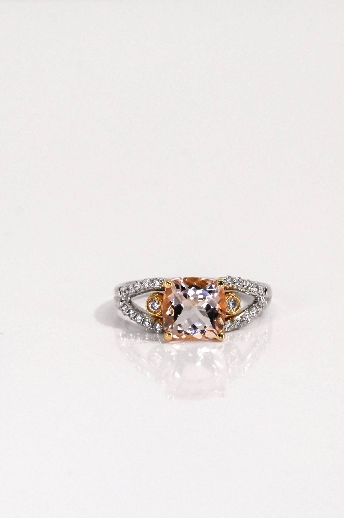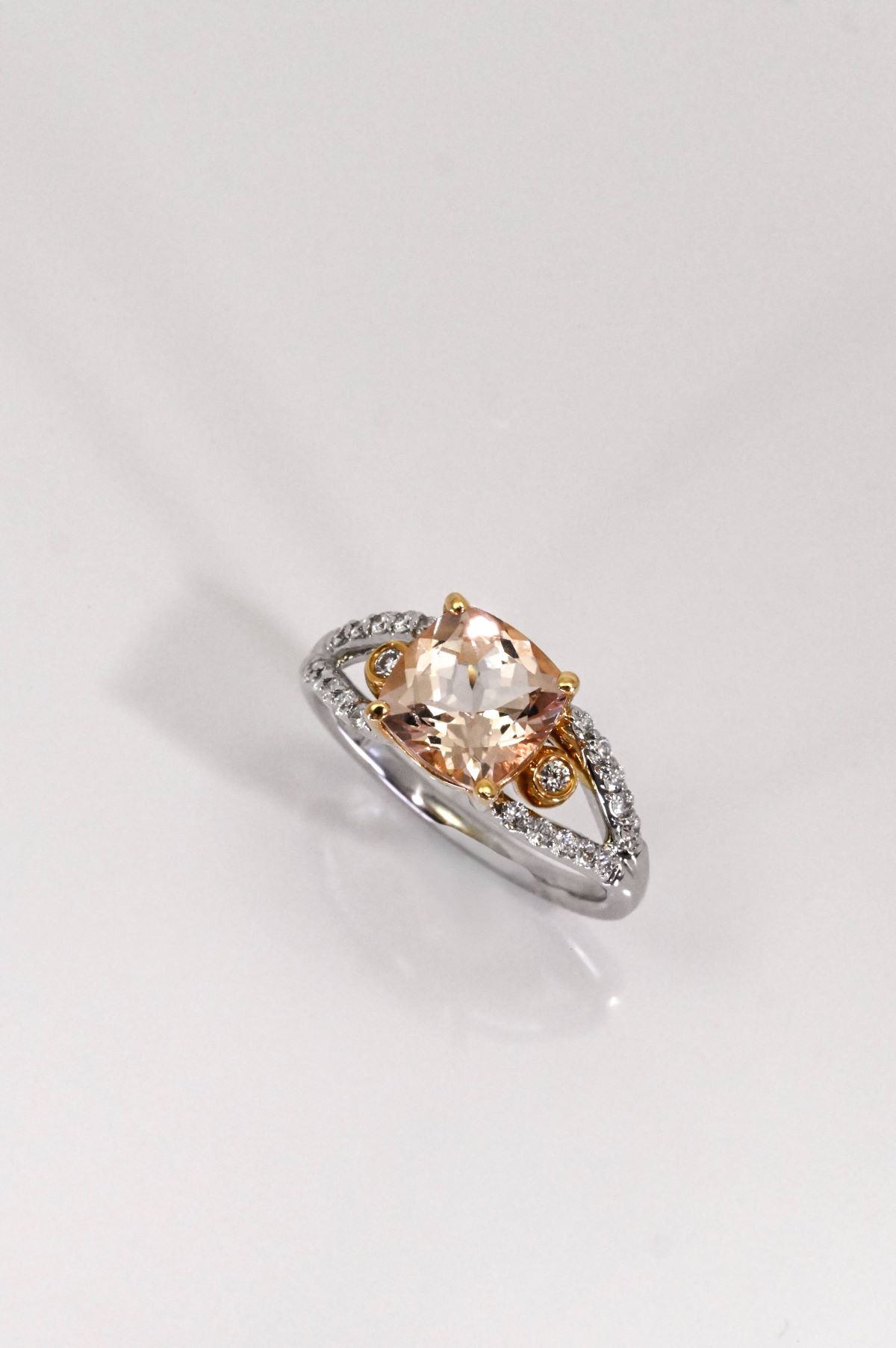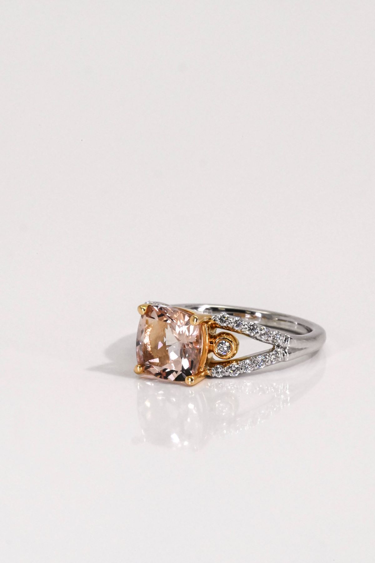 Romantic sophistication meets refined craftsmanship in this striking 18Kt rose and white gold dinner ring. At its heart sits a stunning 2.25ct cushion-cut natural Morganite, a rare pink variety of Beryl known for its soft blush hue and graceful brilliance. The center stone is beautifully accented by a halo and shoulders of round brilliant cut natural diamonds, adding 0.29cts of scintillating sparkle. The warm tones of rose gold contrast elegantly with the cool sheen of white gold, making this piece a true showstopper for special occasions or timeless statement wear.