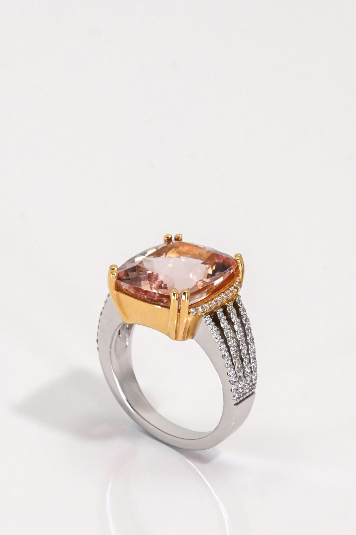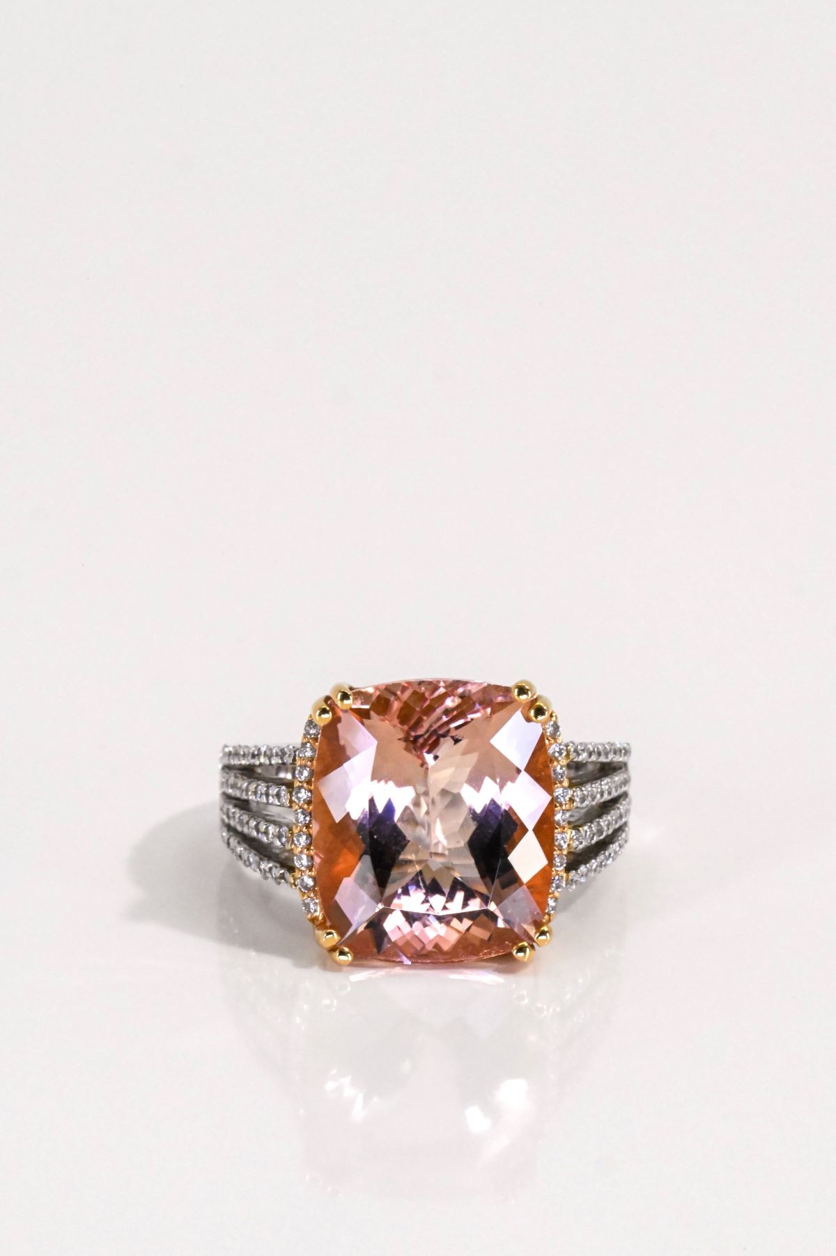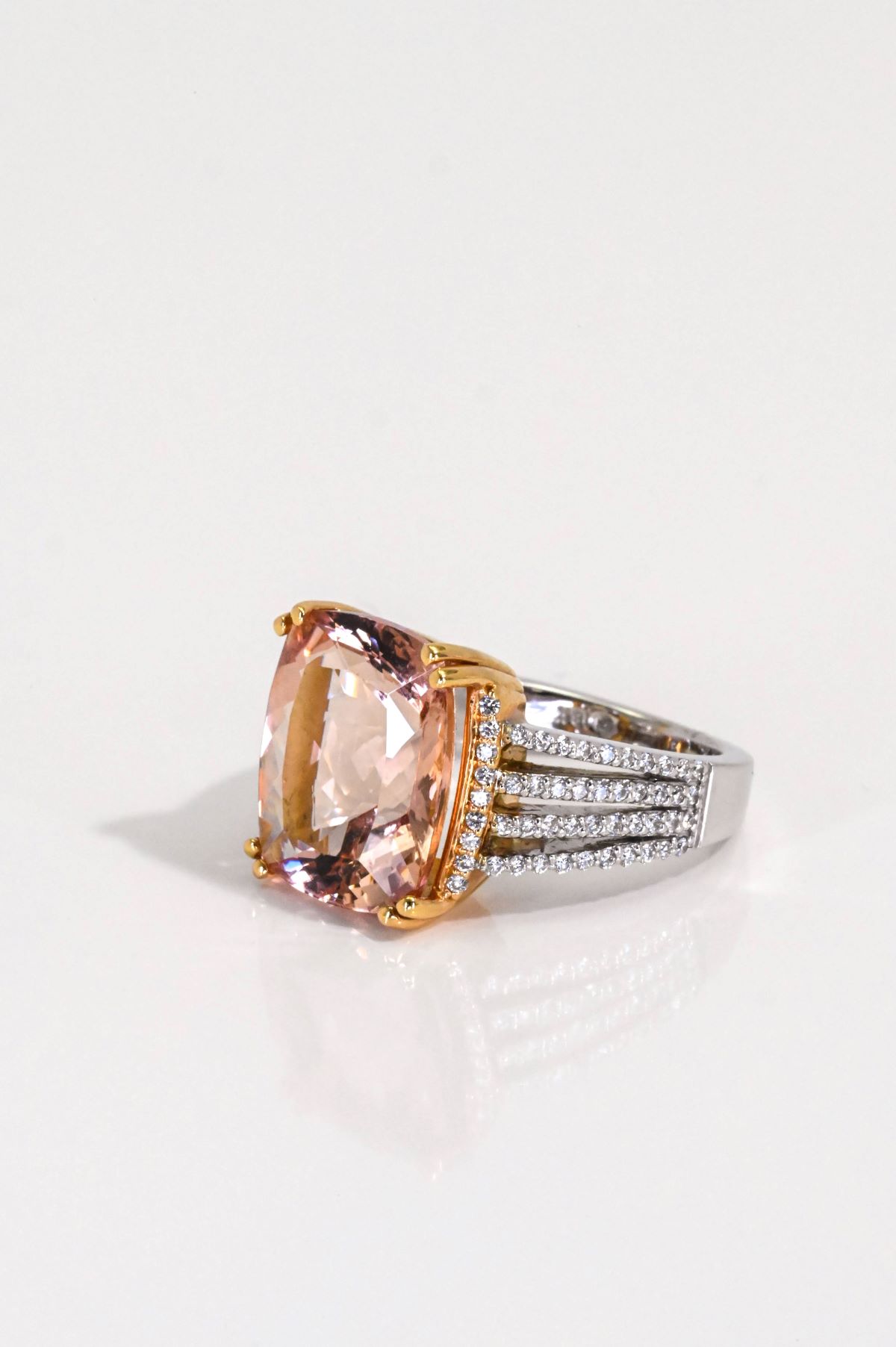 Striking in scale and soft in color, this exquisite 18Kt rose and white gold ring features a breathtaking 7.89ct cushion-cut Morganite as its radiant centerpiece. The warm blush tones of the Morganite are beautifully complemented by the surrounding 0.39cts of round brilliant cut diamonds, adding a refined halo of sparkle. The two-tone setting combines the romantic warmth of rose gold with the cool brilliance of white gold, creating a timeless, feminine design that is both elegant and unforgettable. Perfect as a statement piece, anniversary gift, or heirloom treasure.