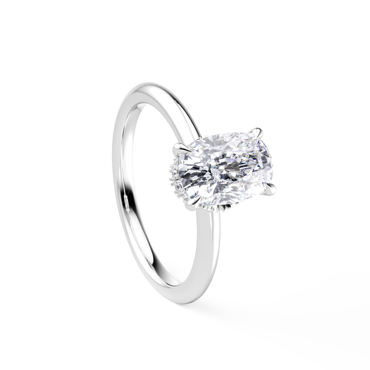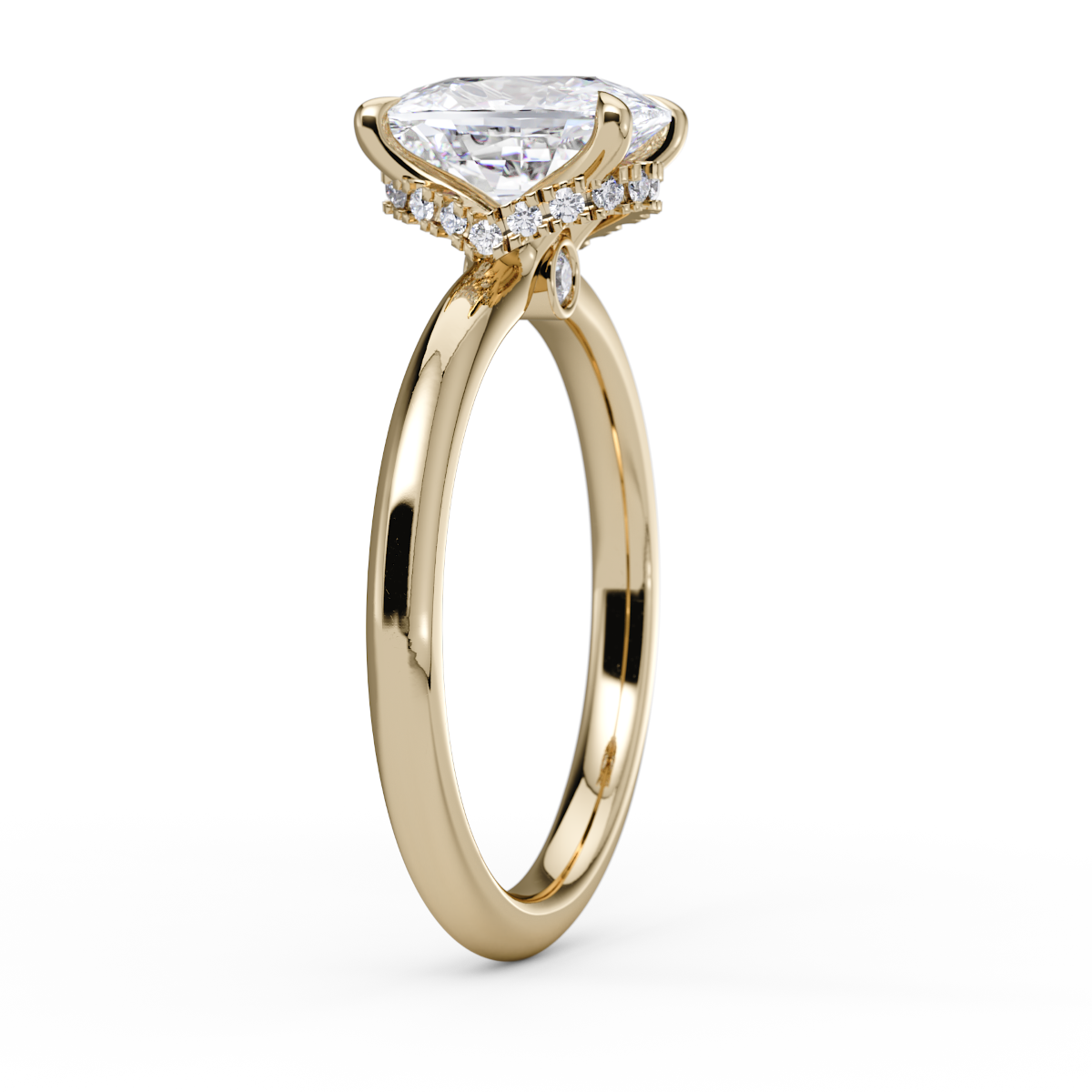 Delicate yet daring, this spring-inspired engagement ring captures the feeling of falling headfirst into love. A brilliant elongated cushion center diamond floats above a hidden halo and tucked-away surprise stones—details only known to those who hold it close. It’s a love letter in gold and sparkle, written just for you.